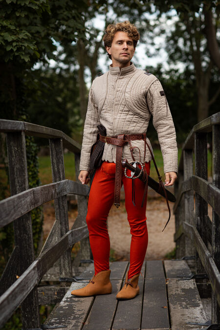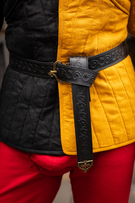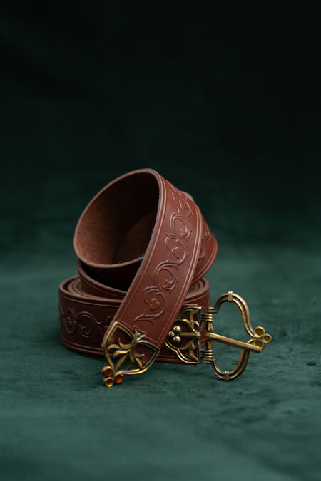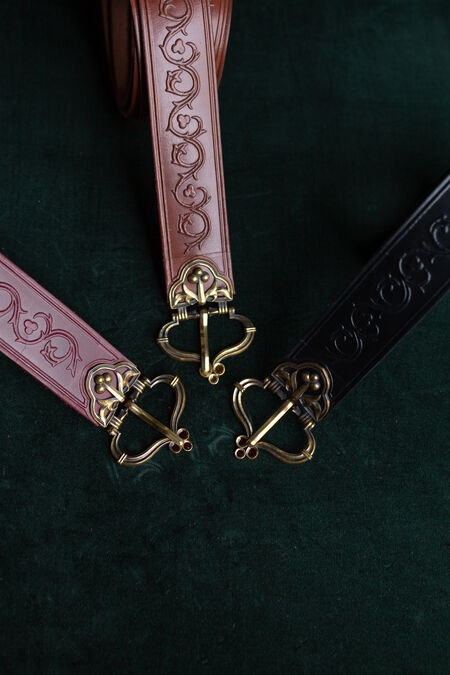 Initially designed to match our new "Bear" line of high-quality leather accessories, this belt however can be used on its own regardless of what your favorite animal is. The embossing along the belt itself and the shape of the casted brass buckle and belt end feature floral ornaments, designed in-house in our signature "looks very organic and medieval, but I don't recall seeing it before" style. The appearance of the belt talks of dignity, nobility and good taste of the wearer, especially when combined with one of the matching bags. It always amuses us to see how such a tiny detail of your costume can shift the whole legend of the character from squire to experienced warrior or from trader to a board member with one beautifully finished piece of leather wrapped around the waist. It doesn't matter whether you are just starting and the belt is your first ever element of medieval costume, or whether it's the final touch to an already outstanding wardrobe – every single line of embossing and the rib on the casting is here to enhance your persona look.