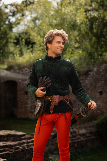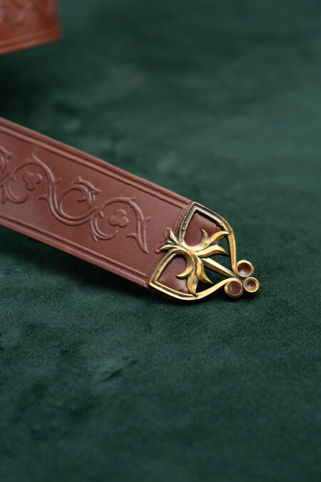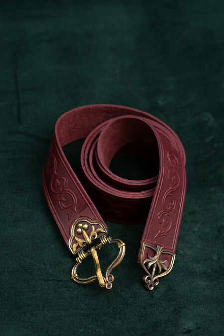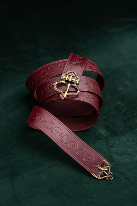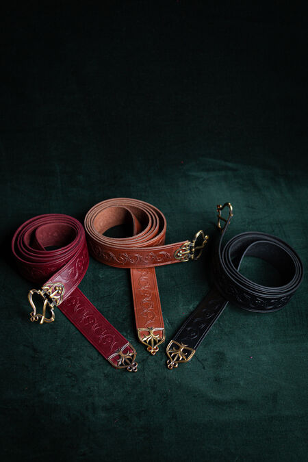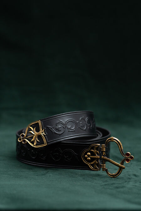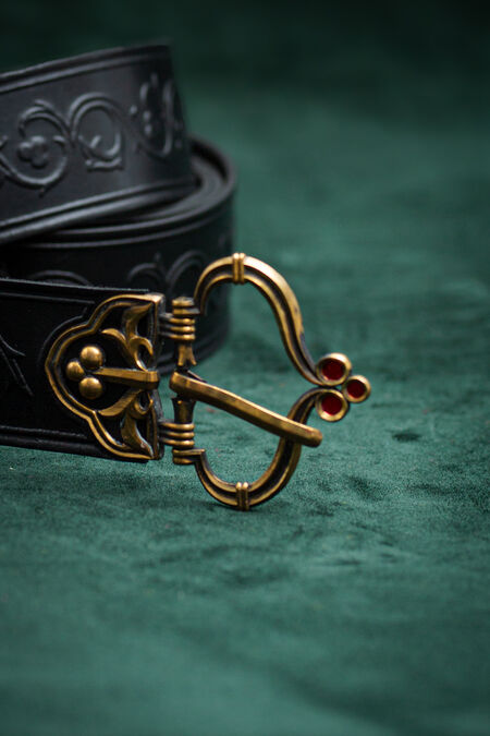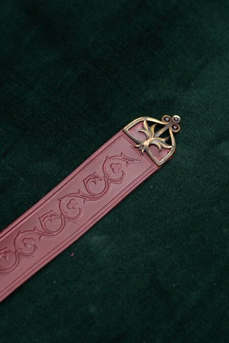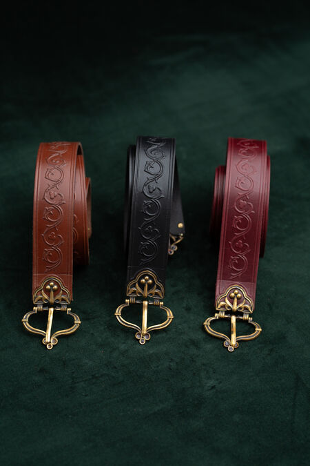 High-quality natural leather is decorated with floral embossing inspired by historical resources. The belt is available in a variety of colours to match your house colours, other accessories or simply to please you with that exact beautiful shade of green you've been looking for quite a while. The buckle and end piece are designed explicitly for this belt, and every single element matches perfectly, contributing to the overall picture. Enamel accents are added to both cast brass elements of the medieval-style belt – if you look at the light through it, you'll notice they are transparent. Under certain lights and angles, those tiny details will glow with colors, adding even more magic to your already striking appearance. This knight's belt is a bit on the wider side and has a fixed length.