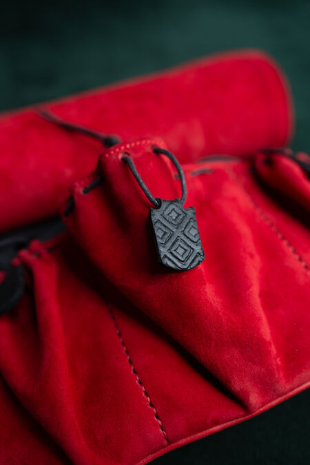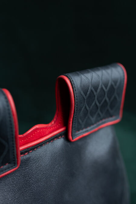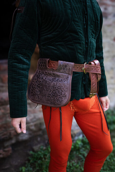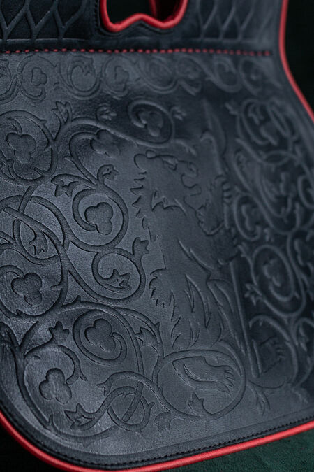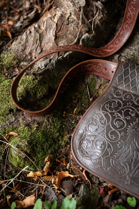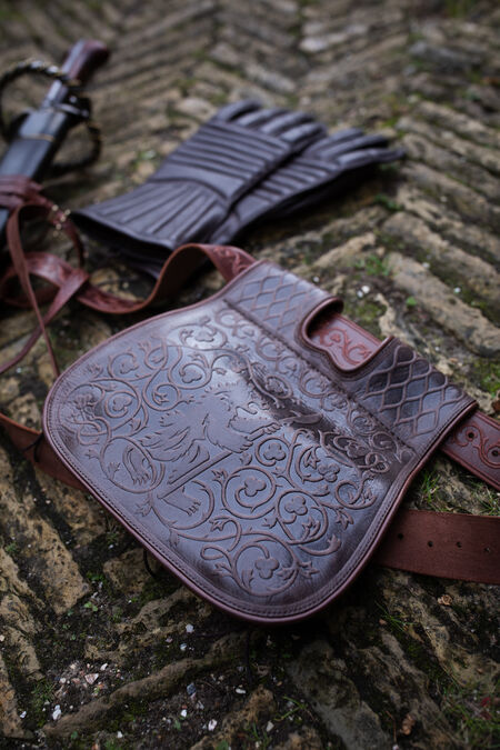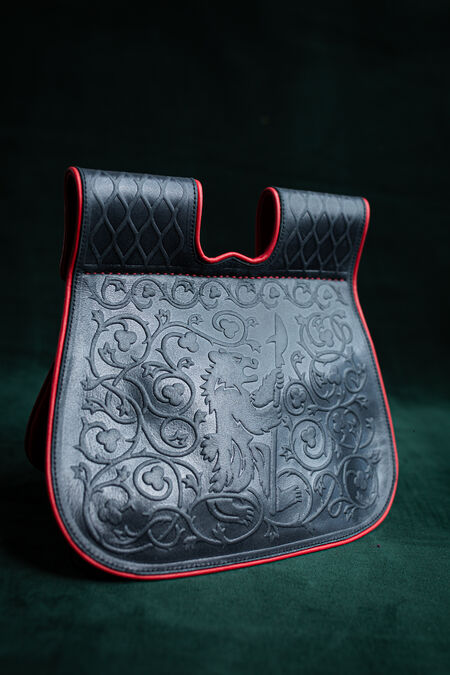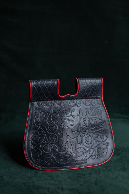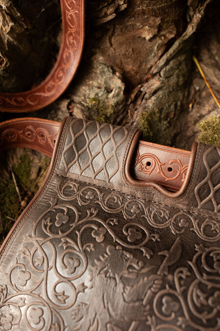 The embossing on the flap depicts a bear surrounded by floral ornaments. To allow better blending with the "Timeless Middle Ages” collection's accessories, the main embossing is accompanied by geometrical patterns on the belt loops. Like many other creations in our store, these motifs are not inherited from an existing historical reference, but are the fruits of our design team's labor. It was inspired by medieval findings and therefore looks very natural as part of the SCA persona's wardrobe.