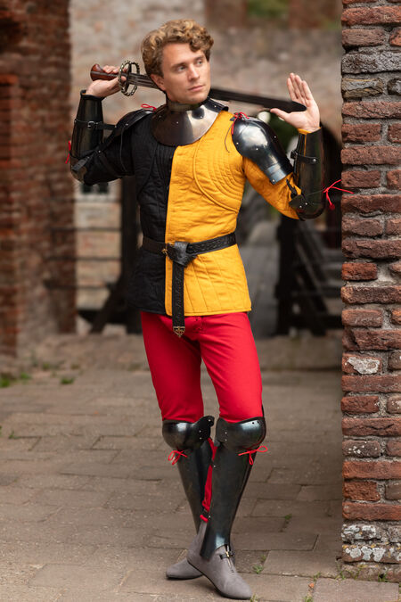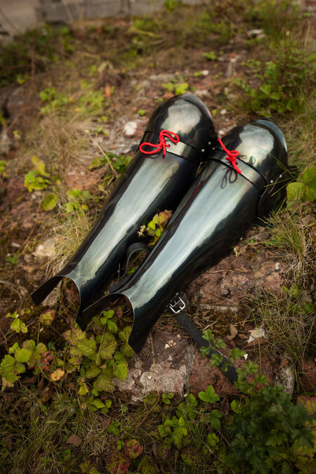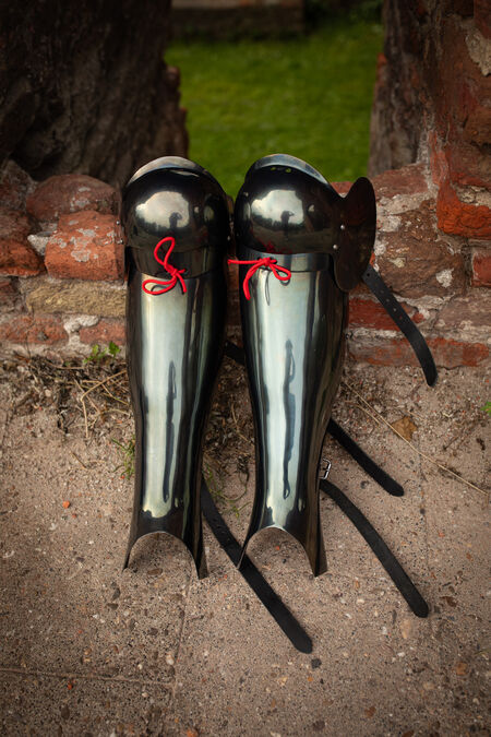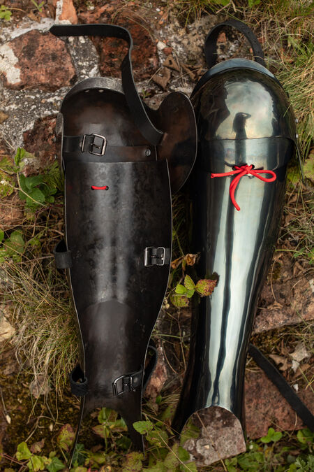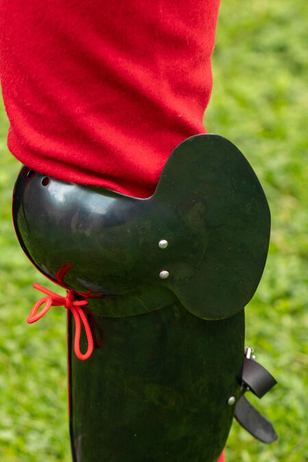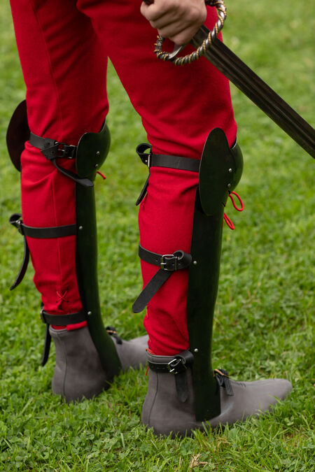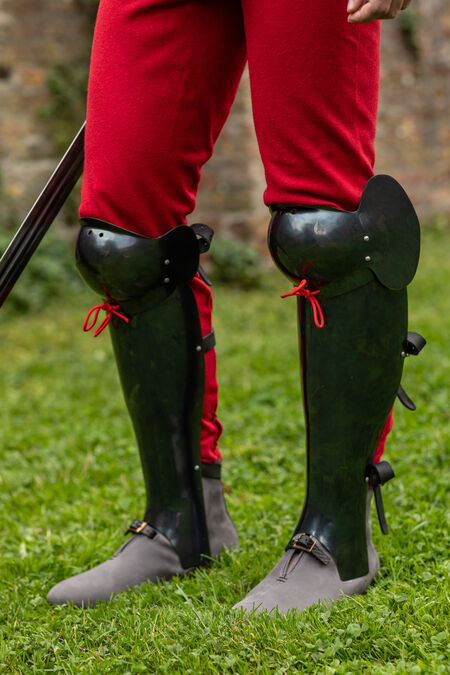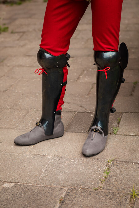 Both parts, greaves and knee cops, can be used (and also purchased) separately, but this kit is the minimum you need for most point-based sword-fighting formats. If you want your thighs protected, please check our Rieneck Armor Legs for reference. You can get these legs with extra cuisses plates for 30% extra.