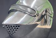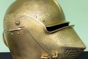 Popular in Central Europe during the 15th and 16th centuries, the Armet is one of the first helmets to completely enclose the head. This style of helmet differs from a close helm (which has a single pivot point) by hinging at the cheeks. To protect the close at the back this style of helmet also features a rondel at the base of the neck.