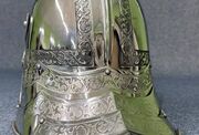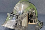We've made this gothic sallet out of 14 gauge stainless steel. It's cold forged, so it holds very well; it features quality dishing and fine border finishing.