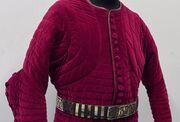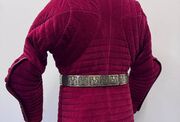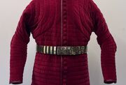 In this vein, ArmStreet developed the King’s Guard line of XIV century armour for the discerning fighter and reenactor. However, we could not stop with the exterior armor, only a gambeson “made for a King”, or his guard, would do to complete this armor kit. ArmStreet is proud to present our limited edition – King’s Guard Gambeson! This is the epitome of what a regal padded under armor garment should be. Made of our exclusive wine-red, patterned velvet, this gambeson will turn heads on the field and at Court. Up close, this gambeson has an amazingly rich and authentic look that is based on the style of pourpoint made famous by Charles de Blois. The gambeson even comes with authentic leather trim and handmade, velvet-cloth covered leather buttons. We have used only the highest quality of materials to create the one-of-a-kind arming garment and that we guarantee you will be proud to wear for many years to come.
