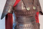 Tassets or war-skirt are a separate piece which technically can be worn separately and even used with different body armor. Pauldrons are attached to the corset with simple leather straps and are also decorated with the matching pattern.