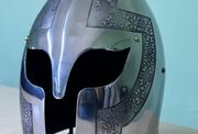 This is a premium helmet, pre-padded and strapped, and ready for combat. The steel is lightweight and the craftsmanship is utterly flawless. All of the materials used are high-quality, and it has been handmade with care by one of our expert blacksmiths.