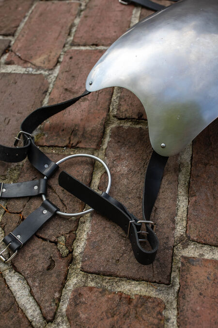 This breastplate is a simplified, practical version of one of our most successful “Dark Wolf” designs. It maintains the practical aspect while being essentially bare of flashy finishing and decor. So, it’s a relatively simple, functional, lightweight (comes in tempered spring steel by default) sword-fighting armor with a reliable leather strapping harness. It will be perfect for many man-at-arms and low rank nobility characters – those who make a living by their sword and bravery.
