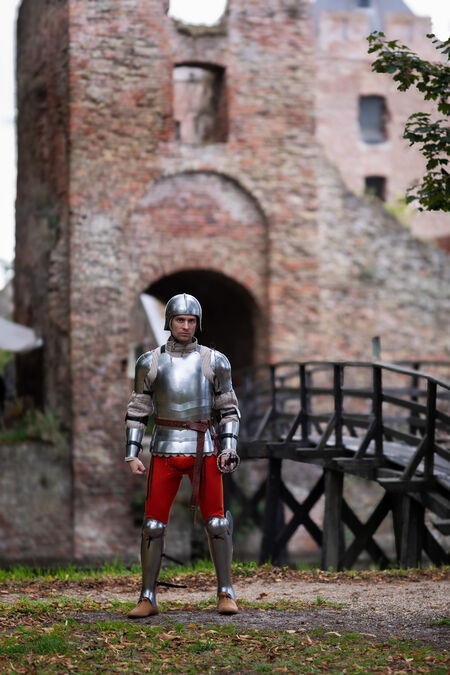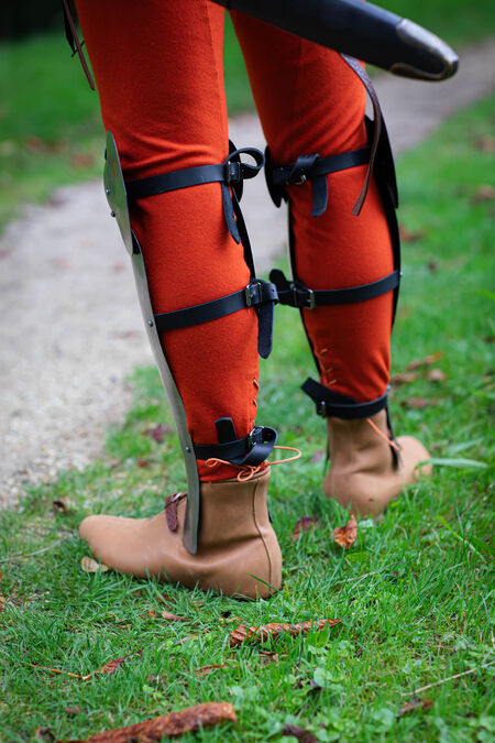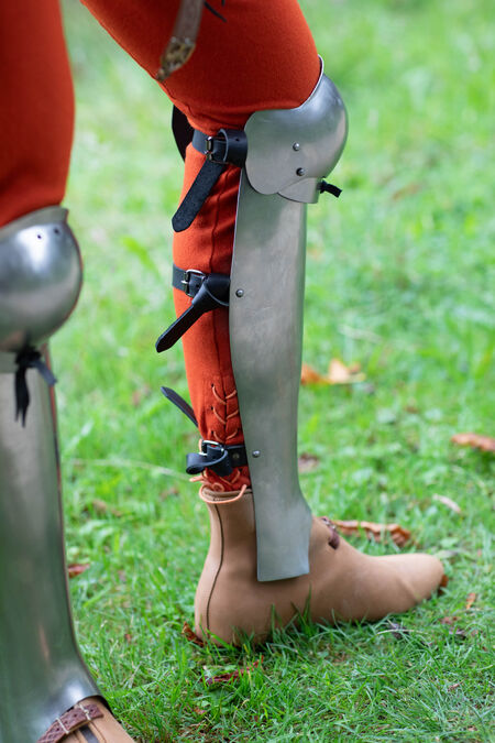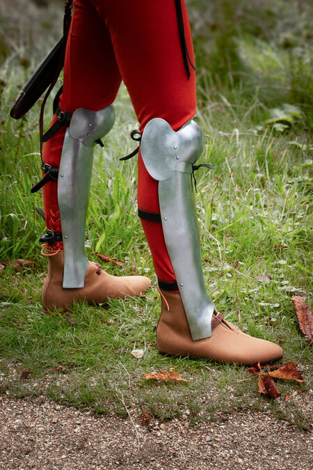 The design of these particular legs is quite simple: a front greave and a laced-up cops will give you basic leg protection. If you want thigh cuisses, you can order them as an extra piece. Take a look at Medieval Rieneck Armor Legs as a reference to the cuisses’ design.