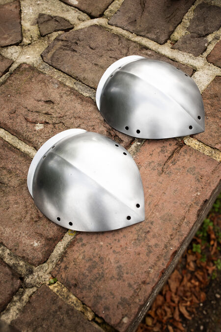 These pauldrons are the simplest option out of all our other shoulder guards. They are simple, have lacing holes all over the edges for bands lacing to the gambeson or HEMA jacket, and are made of hardened spring steel by default, making them quite light and comfortable. You’ll likely stop noticing them after a couple of test fights. Check out the blackened (or brass goldened) pauldrons version here.