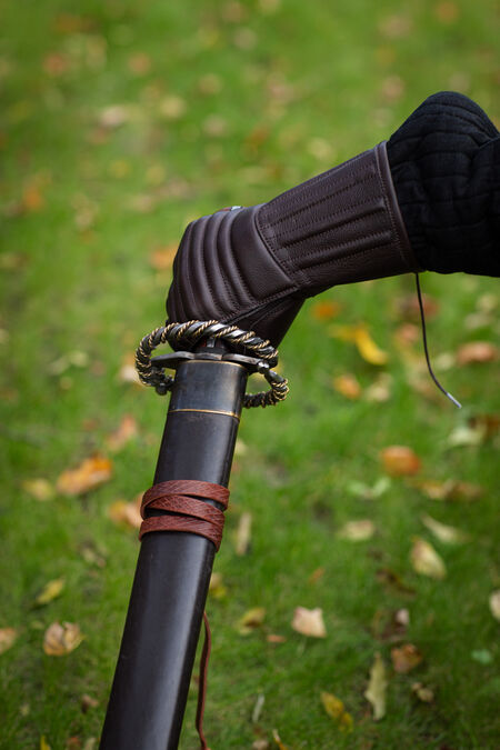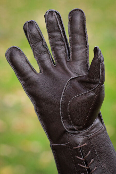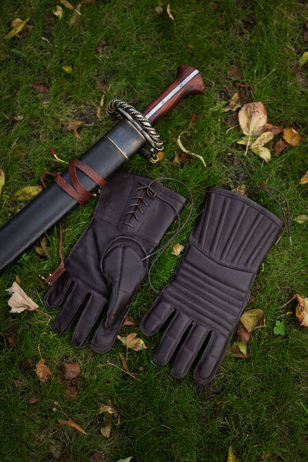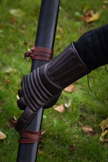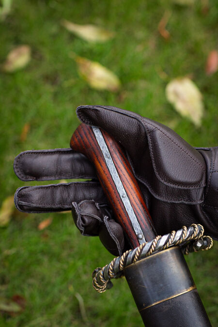 Articulated fingers and tactile properties of the leather allow perfect grip and flexibility, making these gloves suitable for using with both sword and polearms. Made of firmly stitched genuine leather, they are staffed with 5 mm thick foam insulating pads to protect from impacts. Extended cuffs protect the wrists. The gloves cushion and distribute the weight of the weapon.