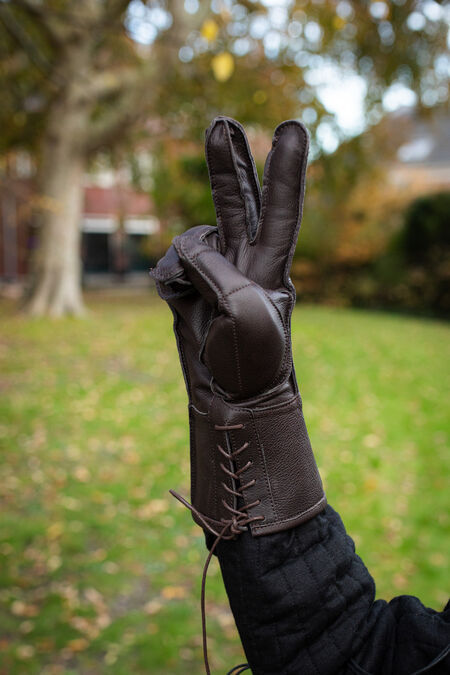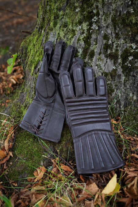 Obviously, gambeson was the main element of the padding protection for a warrior in the Medieval era, but not the only. The gloves were also a part of a full protective armament. Clumsy and bulky padded mittens at first, with the development of the weapons they evolve into better-fitted and laced up gloves intended to absorb blows and protect of abrasions from the armor.