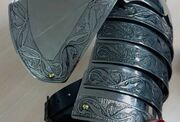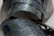 These pauldrons consist of a main solid piece that drapes over the shoulder, protecting both your shoulder blade at the back and your armpit at the front. It provides far greater coverage than other, earlier types of shoulder armor without the need for a besegew. From the main piece, four lames extend downwards, covering your bicep almost to the elbow. At the bottom, the final lame curves up to ensure you retain movement in your joints. There is a buckle at the top of the pauldrons to attach them to your gorget or arming doublet, which will make sure they don’t fall down your arm. Flawless articulation of all of the lames is achieved through traditional methods - leather strapping at the back. There are strong leather straps and medieval cast brass buckles on the biceps that will allow you to secure them around your arm.