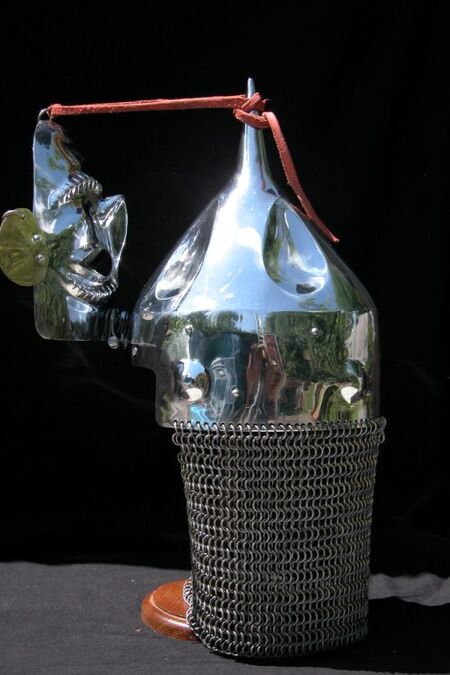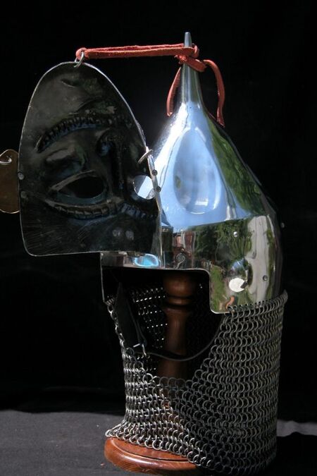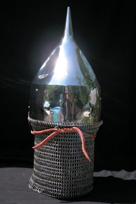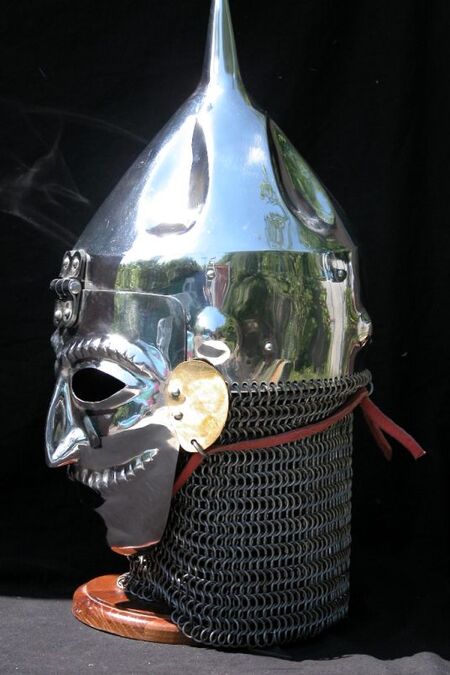This helmet is made in accordance to historical prototype, it's helmet of eastern nomads, "polovci". It's made of 2 mm (14 ga) cold-rolled steel with great face-visor and number of impressive authentic accentss. Integrated armoring cap is included.Great design and very skilled craftsmanship - one of the most exclusive ArmStreet's helmets.