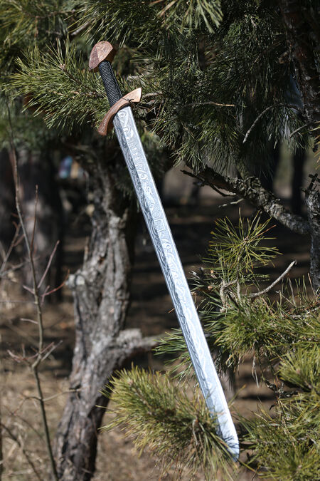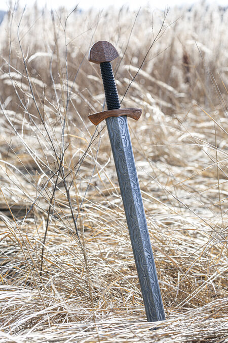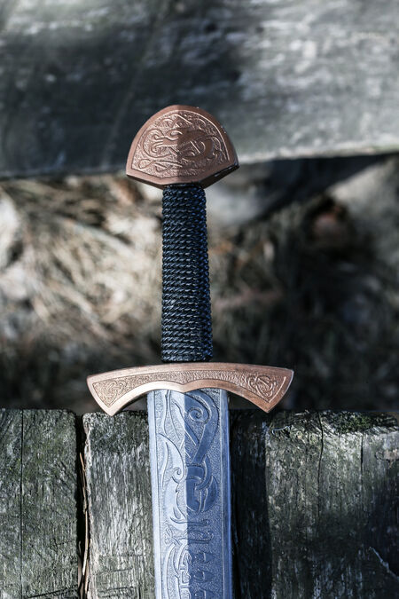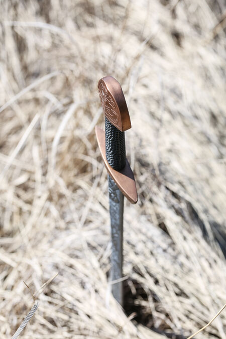 The shape of this sword is traditionally Viking age. It is meant to be used in one hand so it has a short grip that fits well into the palm of your hand, small quillions, and a nicely shaped pommel. The shape of the sword itself is quite straight, coming to a gently rounded point at the end. All of the designs on this sword were designed and crafted in-house by our team of designers, including the artistic knotwork.
