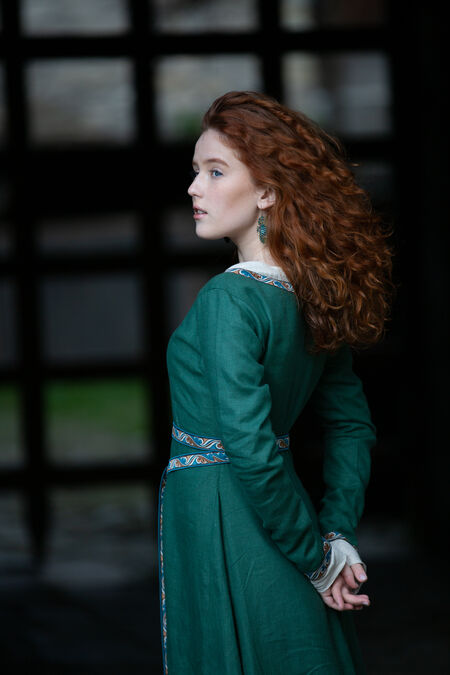 This dress is floor length and is slightly more fitted around the waist than a traditional tunic may have been, though it’s still close to early medieval tunics and dresses. The pattern is quite similar to a traditional Viking t-tunic, with gussets under the arms for movement and a few gores in the dress to give it a bit more volume without making it cumbersome. It has a scooped neckline that is neither high nor low and has lots of space in the underarm for movement and dancing. The sleeves are long and looser at the shoulder and more tapered at the wrist.