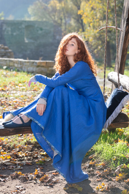 This flax linen tunic is based on simple, historical patterns and made to be pretty, comfortable, and universal to the medieval era. The “Sea Born” collection has a sense of wanderlust to it, for those who wish to wander misty coasts and dance through the waves of desolate, unnamed beaches. The designs, jewelry, and trims throughout the collection all have elements of the sea to tie them together.