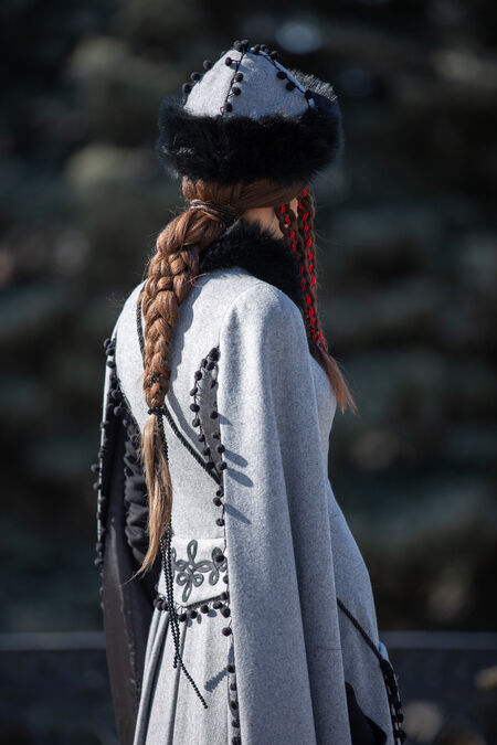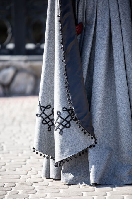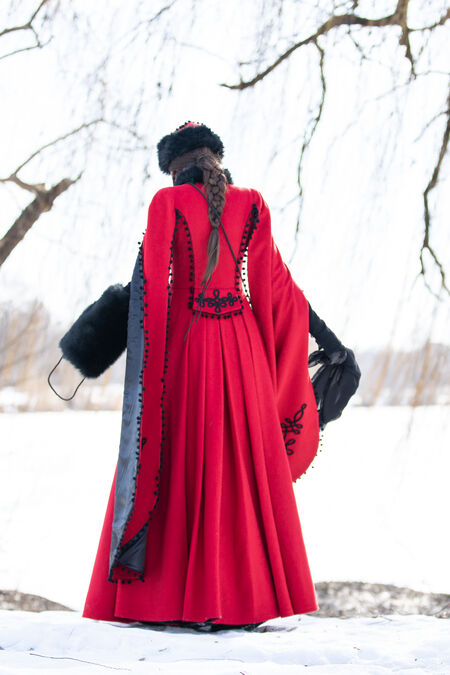 This coat combines elements of Manchu clothing and Balkan designs in a way that is flattering with our signature ArmStreet twist. It is meant as an outer layer and is slim-fitted like many items of later European garb. It is tapered in at the waist before flowing out in a series of generous pleats at the back and gores at the front, giving you lots of room to walk and plenty of insulation on cold nights. We have made this coat with toggles in the middle to keep in closed, as well as added hooks as a safeguard so you don’t have to worry about it tearing open in the wind. Beautiful long sleeves give this coat a formal gown-like appeal, falling gracefully to just below your knees. The sleeves afford this garment a certain presence that will no doubt attract attention and make it clear that you are a person to be taken seriously.