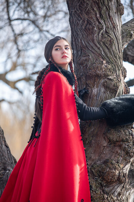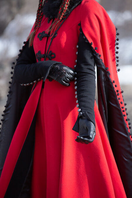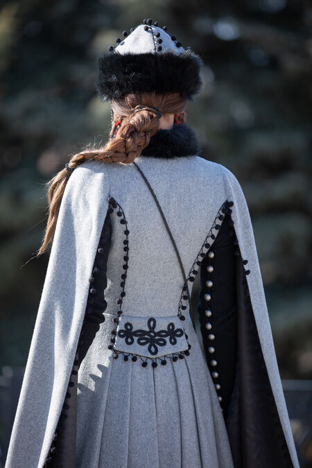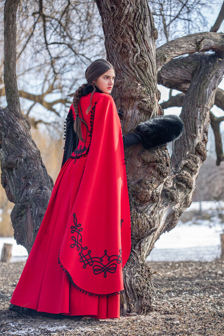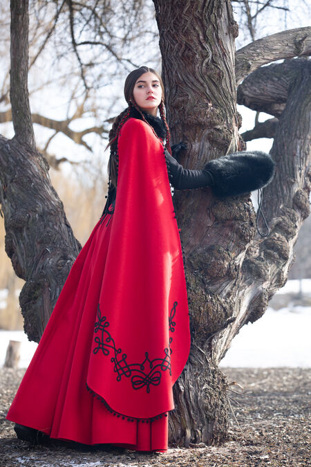 What really sets this coat apart is the materials. Historical textiles have been used where possible, with some more modern touches coming in to finish it off. The majority of this coat is made from wool that drapes incredibly and will provide you with some water resistance. Around the neckline, you’ll find faux-fur to give you more warmth as well as a touch of luxury. The Machu influence comes in with the details - the toggles along with the decorations on the bottom, back and sleeves are embellished with beads. Pom-pom like trim is used as well along the sleeves and back of the dress which continues these motifs. Satin lining is used throughout to ensure that the coat slips on and off easily, as well as creating a shiny texture that contrasts with the flat wool.