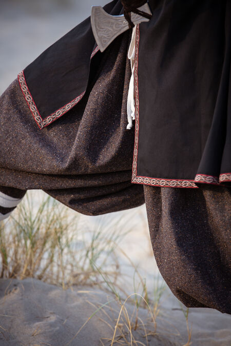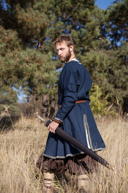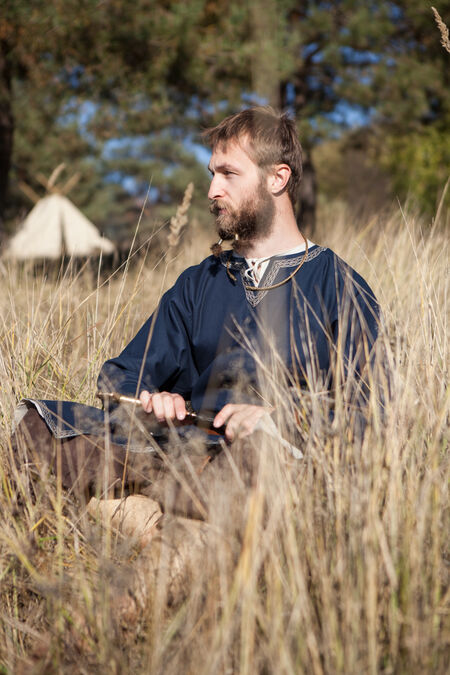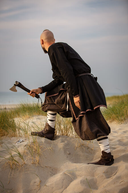 Instead of using classic and simple T-shape pattern, we developed this tunic based on less known, but more comfortable Kragelund Mose tunic design (this pattern is known by Norman tunic found on a body in a Danish bog at Kragelund Mose). In accordance to the original it has both back and front slits and its sleeve design provides better fit and more flexibility for arms.