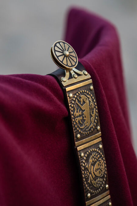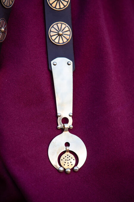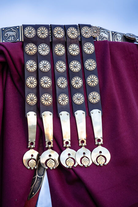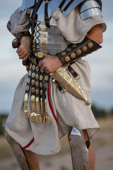 The balteum attach to the larger belt and hang down in front to make an “apron”. It has been speculated that they exist to protect the groin, but this has never been proven nor was it documented. This belt has 5 separate baltea, adorned with 5 etched bullae which have a diameter of 3cm (1 3/16 in). The Pensila at the bottom are also made from brass, laser cut with hand-engraved dots. Including the Pensilia, each baltea is about 41cm (16 9/64 in) long at the photos, but the length can be chosen by you at the "Measurements" section.