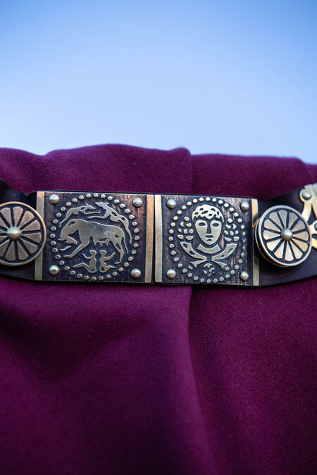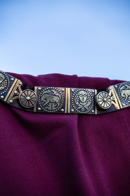 This Cingulum is based on historical sources but has been embellished by our imaginations. We have used modern technologies and high-quality materials to create something that is beautiful, durable, and probably much nicer to wear than actual Ancient Roman clothing. We have used strong leather and quality brass, and feel that the quality is obvious just looking at the piece.