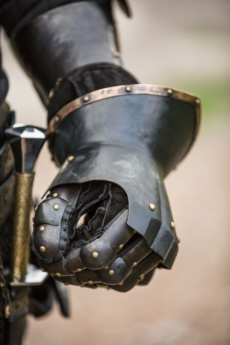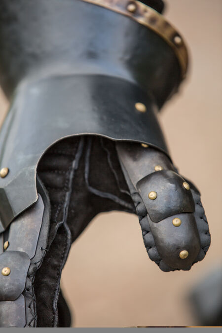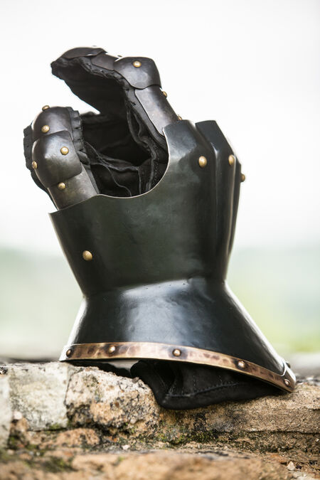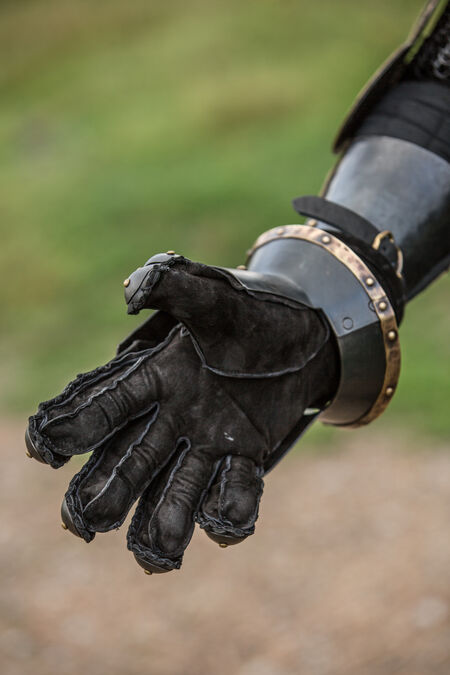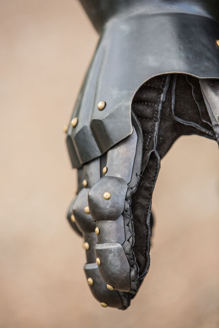 Our famous hourglass gauntlets are back, yet again, with a new look! These transitional gauntlets look right at home with late XIV-XV century kit, and were made to go with our new Wayward Knight collection, a functional fighting kit with a stunning blackened steel finish. Though we advertise them as blackened mild steel, we can also make them out of plain mild steel or stainless steel with a satin or mirror finish, so the end result is up to you. Gauntlets of this general design were used for decades and saw many different wars on the hands of everyone, from men-at-arms to knights. They are a great design because they keep your fingers safe but also allow for much more finger movement than clamshells and other designs.