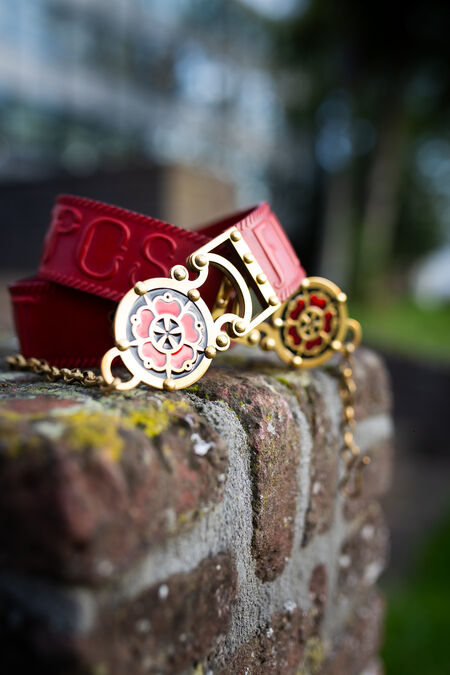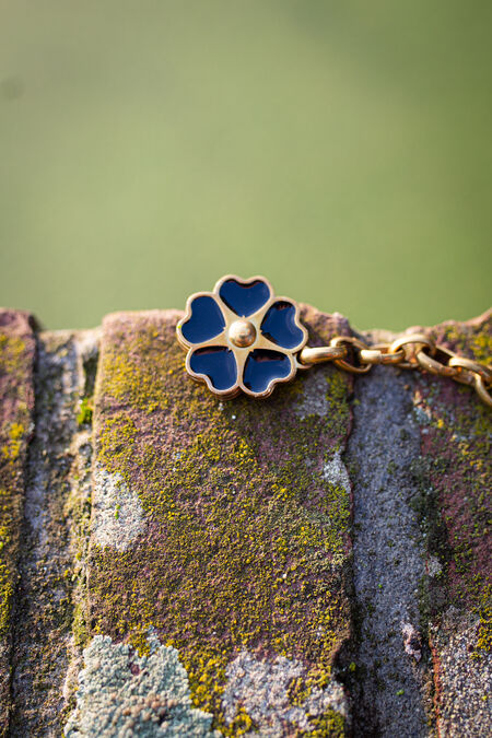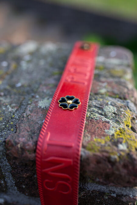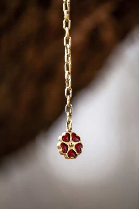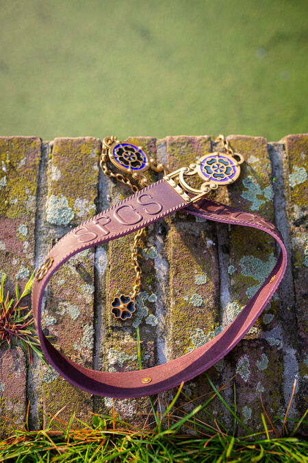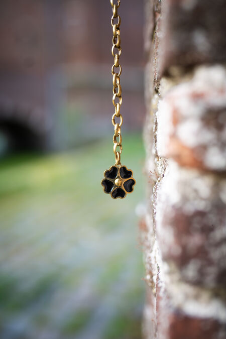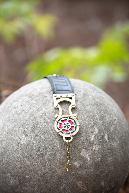 The fittings at the middle of the belt are something new that we have created. They are robustly attached to the leather belt, and end with a rose shape in the middle that has been finished with pop of bright enamel. The colour really brings a little bit of luxury to this belt in a classy way. A chain extends from each of these round roses, one with a long chain and one with a hook. The hook is easily looped around the chain, with the remaining chain dangling down gracefully.