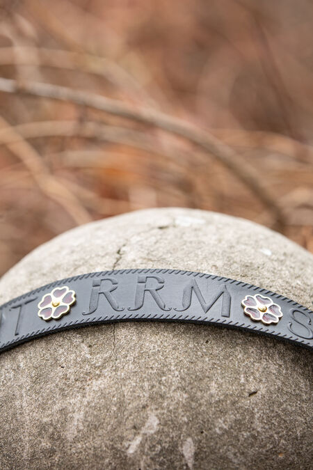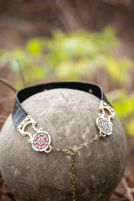 The base for this belt is made from high quality leather which would look right at home at a luxury leather good store - it is rich in colour, but also very strong and will weather wonderfully. We have embossed the leather with latin phrasing "Fallaces sunt rerum species" that equates to “appears not what it seems to be”. This phrase implies that the wearer is perhaps a little bit more complicated, or has hidden talents that may not be obviously visible. We imagine that it alludes to sharp intelligence and cunning that our “German Rose” character hides with her innocent face. The font used on this belt is unique - it has been completely designed in house but has a medieval/ renaissance look it, like beautiful, neat calligraphy.