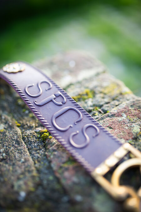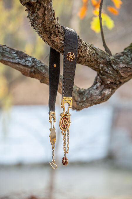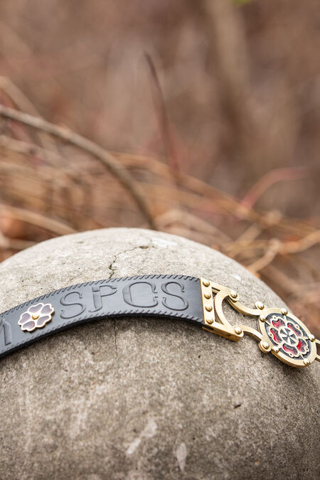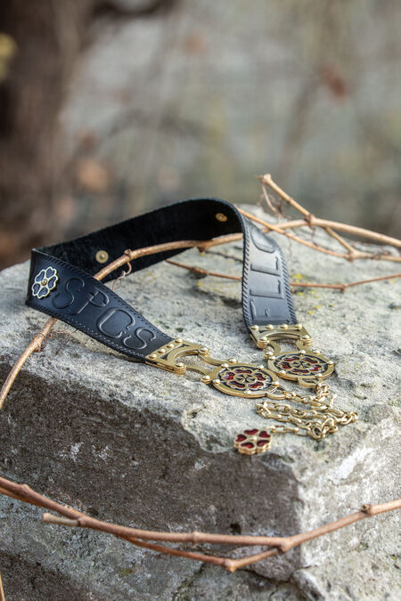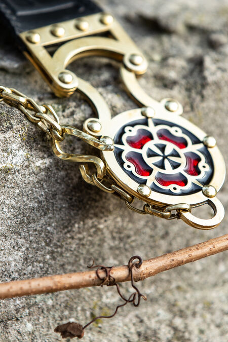There are brass accents between the words, made from 1.5mm brass which has been laser cut in order to get a perfect, crisp shape. They look similar to little roses and are riveted onto the belt. This belt closes in the middle with a hook and chain, similar to other women’s belts found from the 14th-16th century. This allows for the belt to be a little bit adjustable, though if the measurements are too inaccurate, you risk the middle part of the chain hanging off centre and ruining the clean aesthetic.