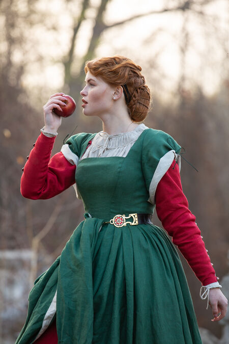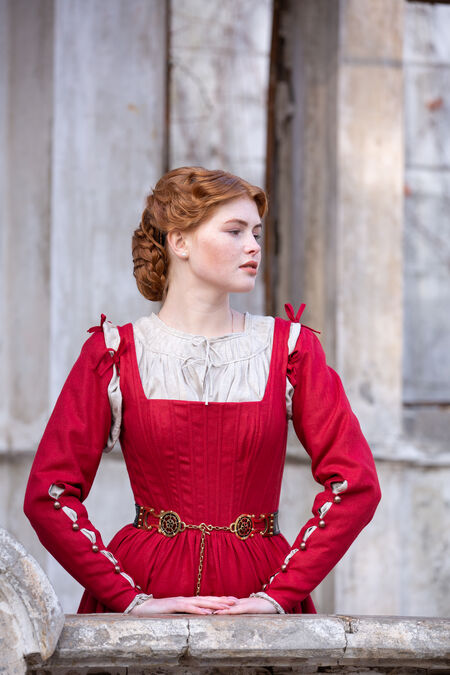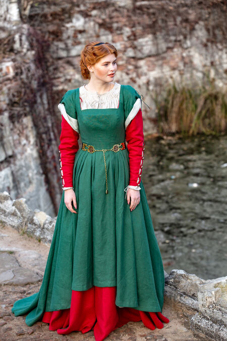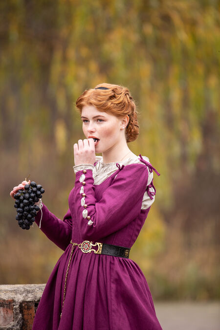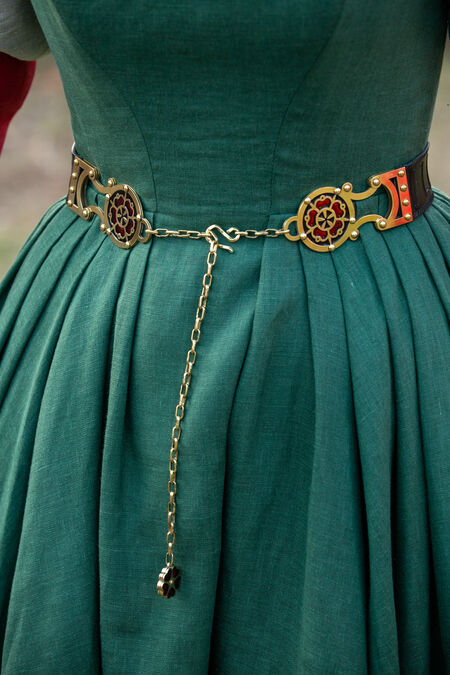 Our “German Rose” collection is gorgeous in an understated way. We have taken inspiration from history in order to create something that is still magnificent and striking, but also still subdued. With this whole collection, we’ve used mostly plain linen for the dresses, meaning it has a lot of lush, simple fabric to accentuate the wearer’s natural beauty. Instead of relying on fancy trim or embroidery, we have let the flattering shape and expert tailoring of the dress speak for itself. We thought that with the belt we should do something a little bit more ornate and bring in a few more textures, so that it can be a statement piece next to the otherwise quite plain dress.