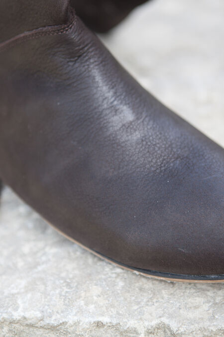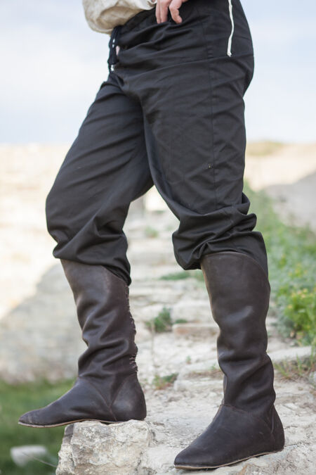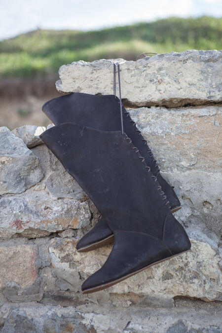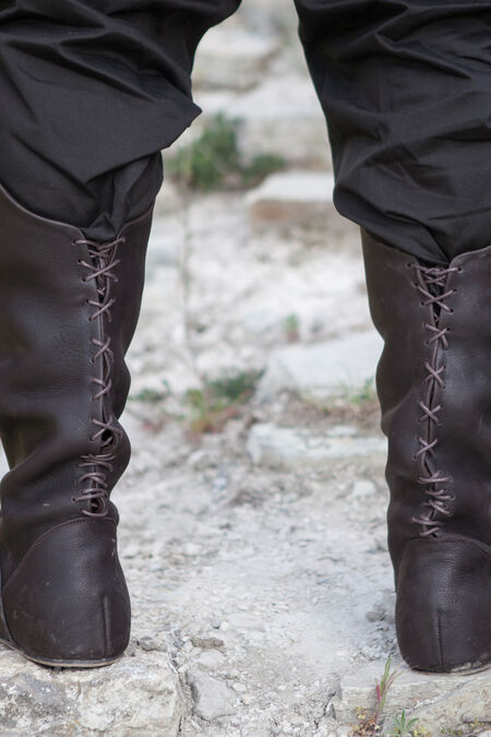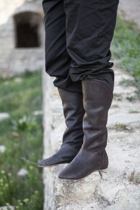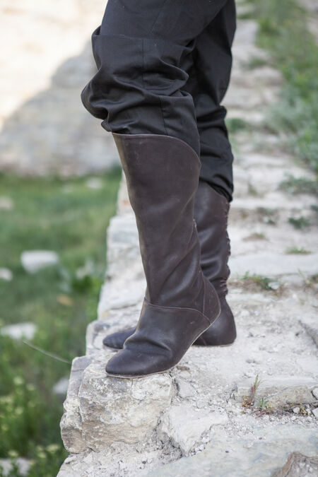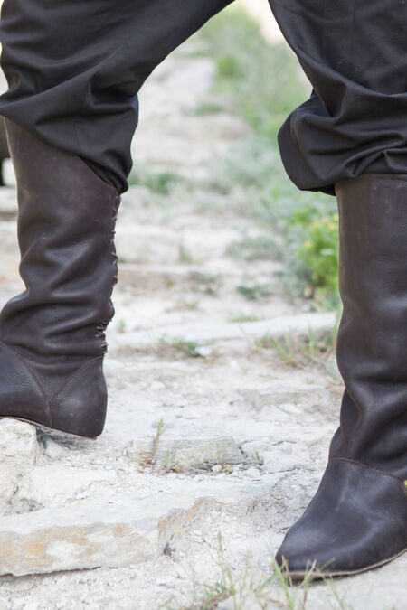 These boots have modern soles that ensure a secure grip and are perfect for different types of activity - from usual walking to reenactment medieval fighting. They consist of several layers: leather insole, leather fiber board, porous breathable orthopedic base and ribbed rubber outsole. This model cannot be made with authentic soles, but one can find many other historically accurate models with leather soles in our store.