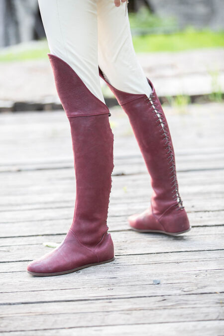 Made from genuine leather, they are soft and nice to the touch, but also robust so they will hold their structure well. At the back of the boot, you will find countless lacing holes, where you can put your cord through to get the best fit possible. These boots come up to your knee and then flare out slightly to cover the top of your knee and become almost thigh-high. The actual foot part of the shoe is pointed and feminine, giving them a fantastic shape overall.