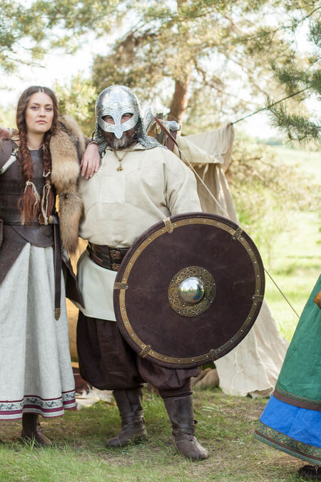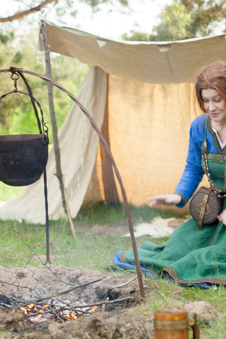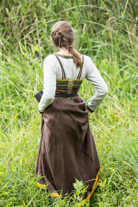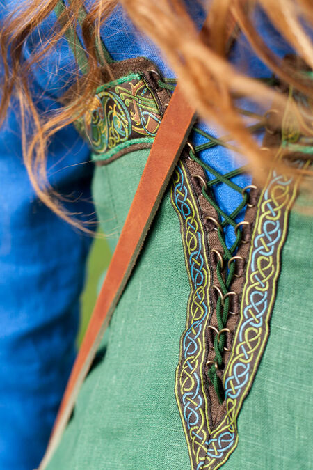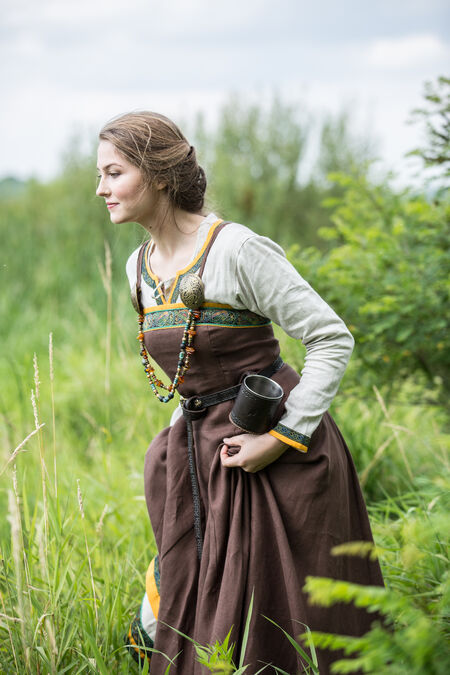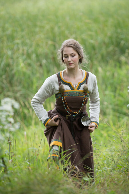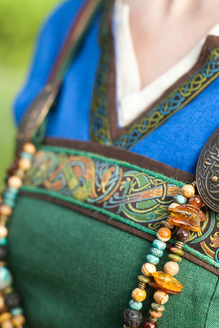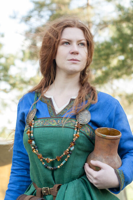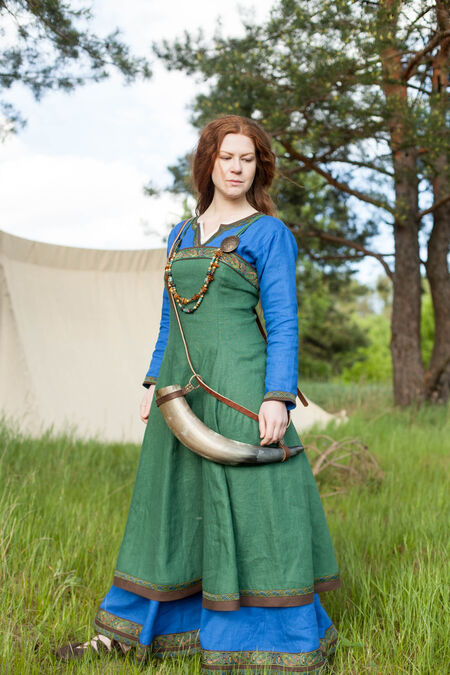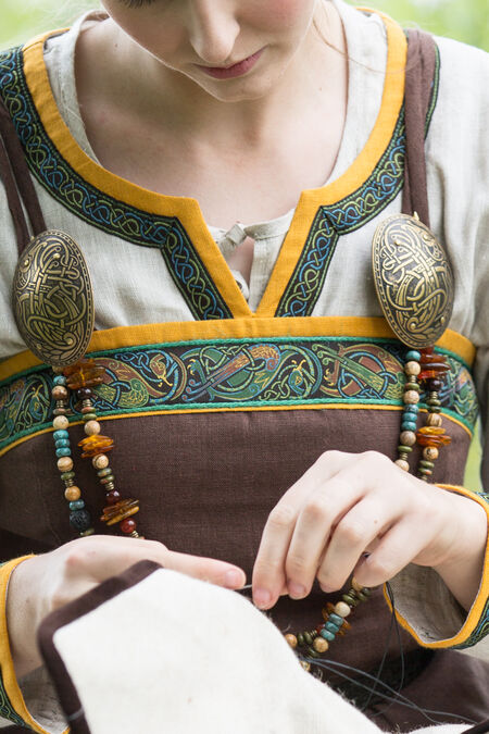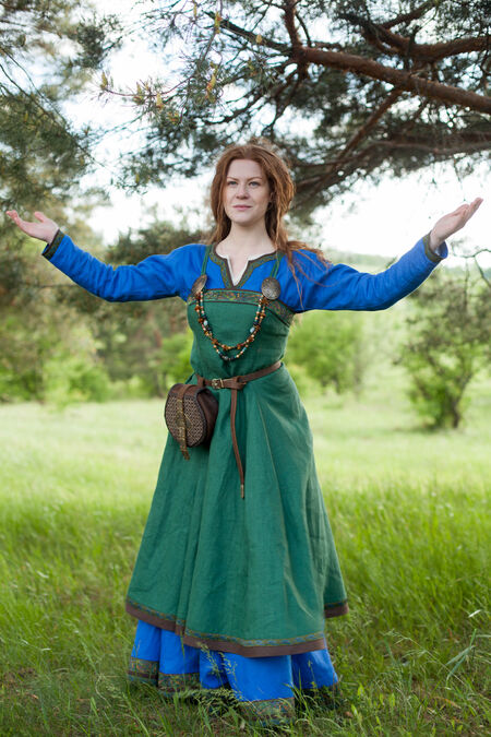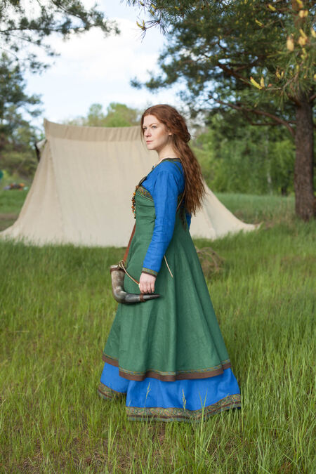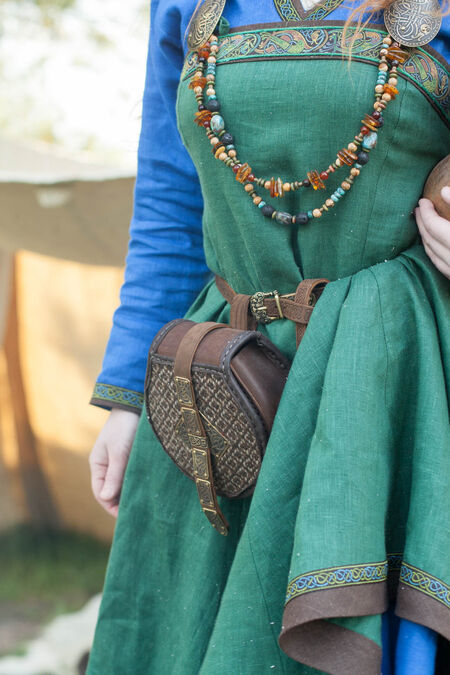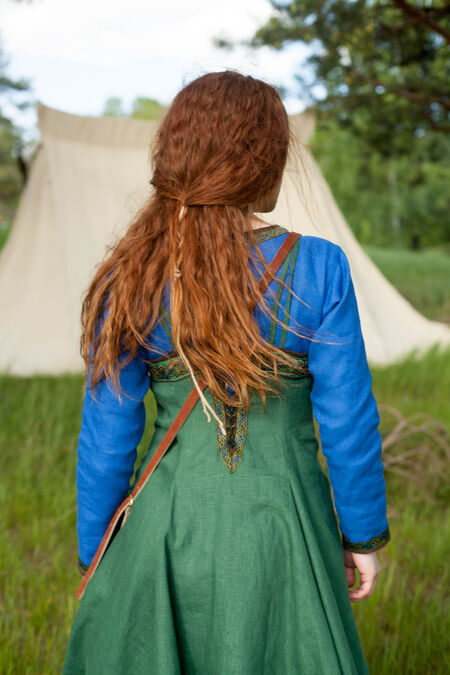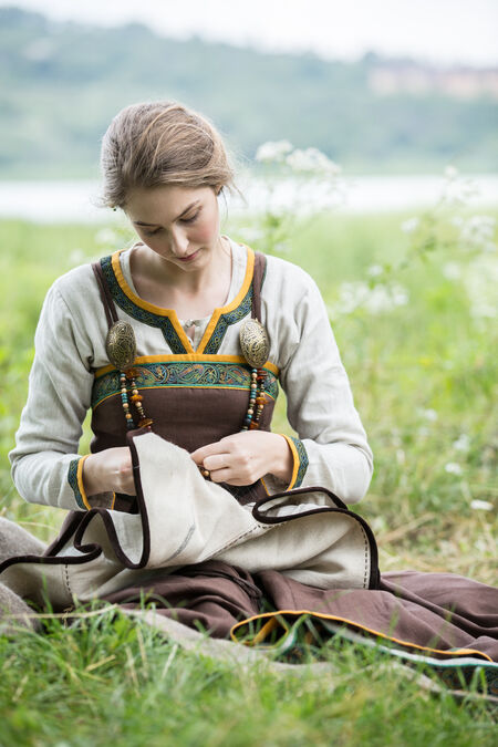 An apron is a recognizable and well-known part of Viking's costume. Our design is based on Hedeby harbour designs reconstruction and illustrations by Shelagh Lewins. We modified the original pattern making it a little bit more complicated to make a skirt wider and provide better fit.