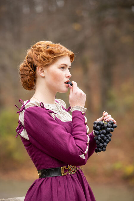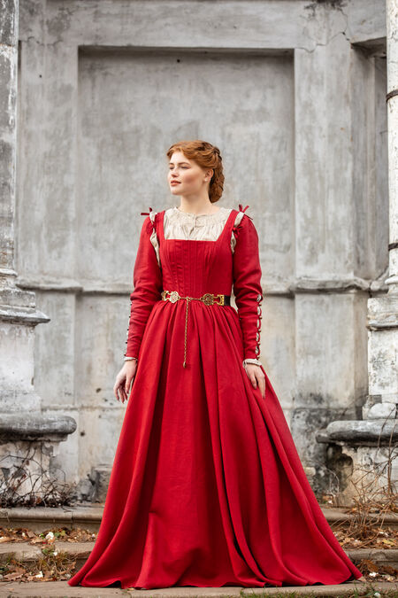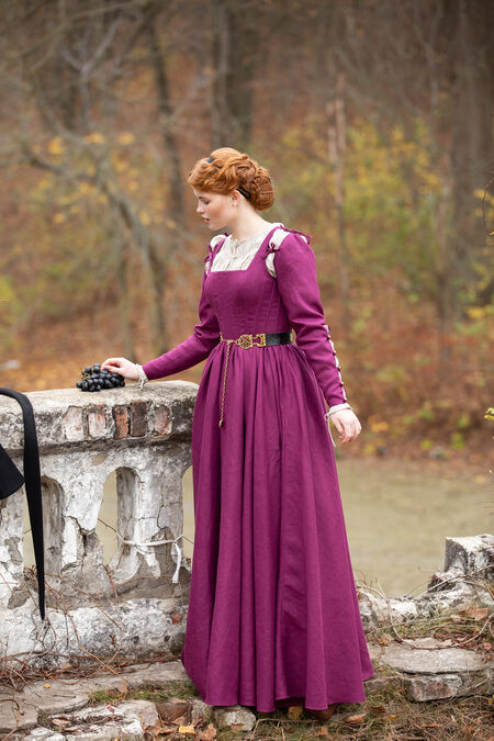 This dress is heavily inspired by the 16th century, especially Woensam paintings. We begin to see the basic garments of the XIV-XV century branch out and become more structured and higher waisted. This design probably would have been worn by a woman of higher status, as the lacing up the back would be difficult to do up on her own, so she would have had a servant or handmaiden. The base of the German dress is gorgeously simple, though, leaving lots of room for you to make it your own and customize it in a way that suits your persona or character. Who knows - maybe your peasant character just happens to be very good at doing up her own back lacing!