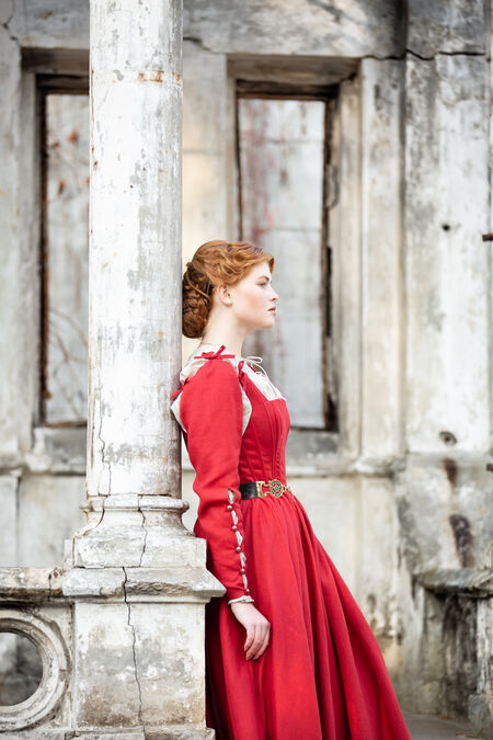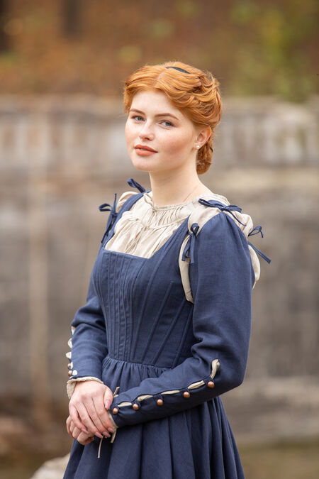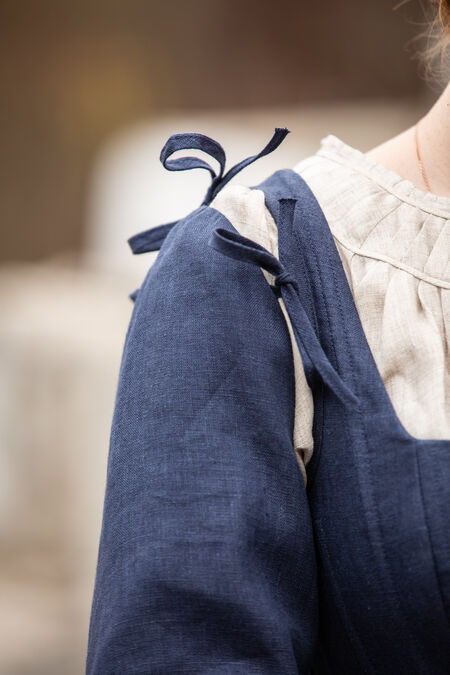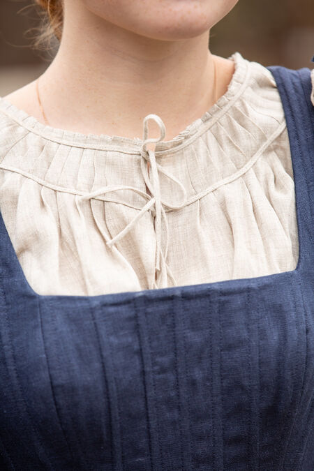 This German medieval dress is elegant and simple, allowing your natural beauty to speak for itself while enhancing all of our best assets in all of the right places. For many years, our boned kirtle has been one of our best selling dresses. Though it’s not as embellished as some of our other collections or adorned with trim, it holds a simple, respectful beauty that is hard to deny. High-quality flax linen is combined with a flattering silhouette, a tight bodice and an elegantly draped skirt. Tie on sleeves add a little bit of elegance, with a few bold buttons along the forearm to add some functional decoration.