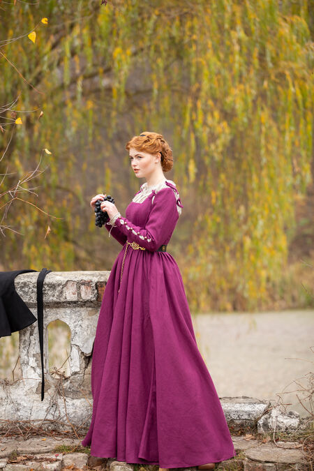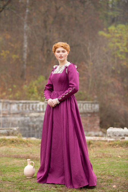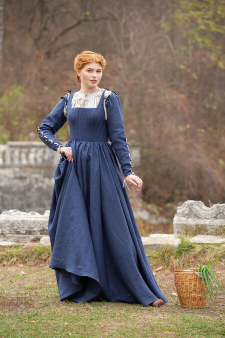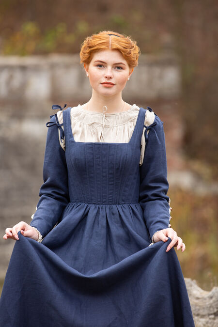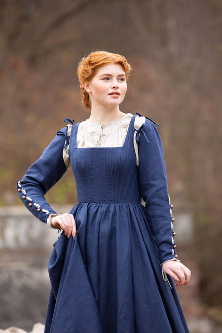 This German medieval dress is elegant and simple, allowing your natural beauty to speak for itself while enhancing all of our best assets in all of the right places. For many years, our boned kirtle has been one of our best selling dresses. Though it’s not as embellished as some of our other collections or adorned with trim, it holds a simple, respectful beauty that is hard to deny. High-quality flax linen is combined with a flattering silhouette, a tight bodice and an elegantly draped skirt. Tie on sleeves add a little bit of elegance, with a few bold buttons along the forearm to add some functional decoration.