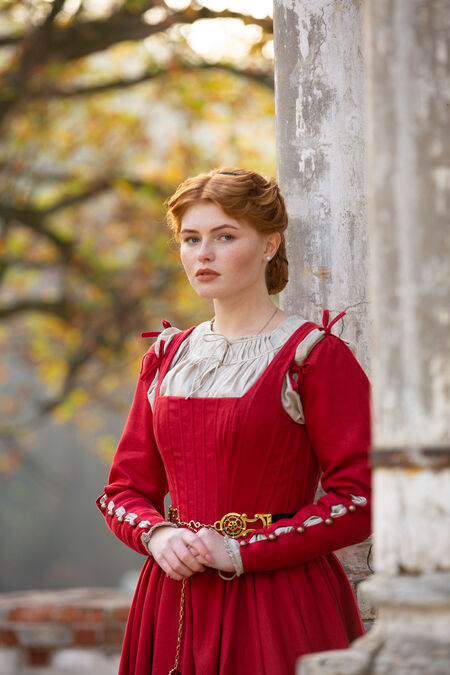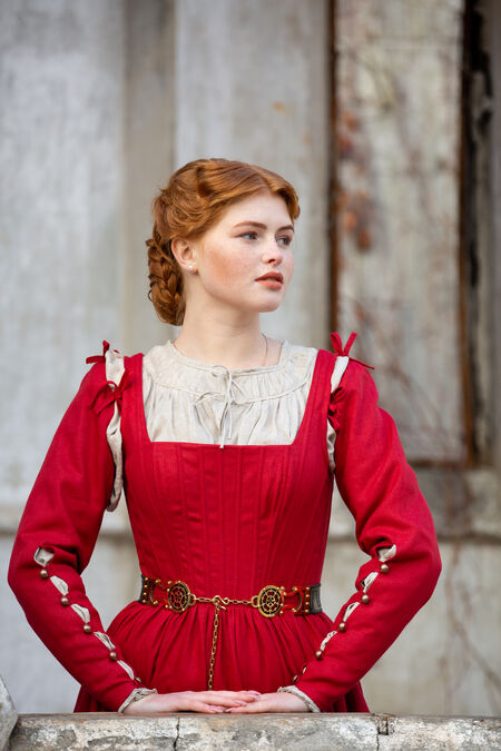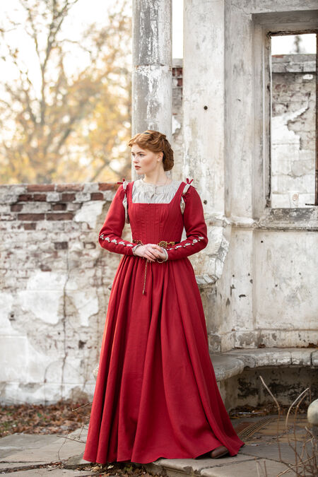This dress is heavily inspired by the 16th century, especially Woensam paintings. We begin to see the basic garments of the XIV-XV century branch out and become more structured and higher waisted. This design probably would have been worn by a woman of higher status, as the lacing up the back would be difficult to do up on her own, so she would have had a servant or handmaiden. The base of the German dress is gorgeously simple, though, leaving lots of room for you to make it your own and customize it in a way that suits your persona or character. Who knows - maybe your peasant character just happens to be very good at doing up her own back lacing!