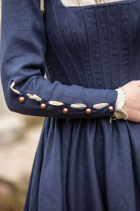 Traditionally, this German women's dress would have been worn with a chemise, as the bust is quite low. The square neckline and boned bodice work together to give you a dainty waist and a high bust, which looks fantastic with the voluminous skirt that drapes to the ground. The sleeves are fitted at the wrist, giving your arms a delicate look, and the buttons break up the fabric to create some contrast with your chemise or shirt underneath. Because the sleeves are detachable, it is up to you if you wear your kirtle with or without.