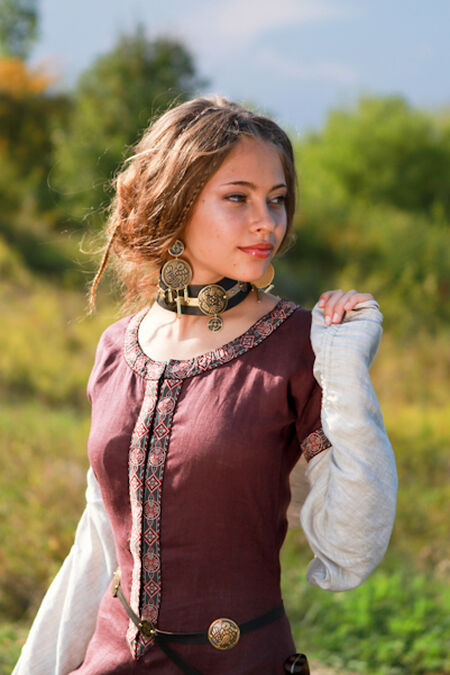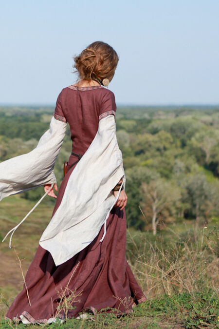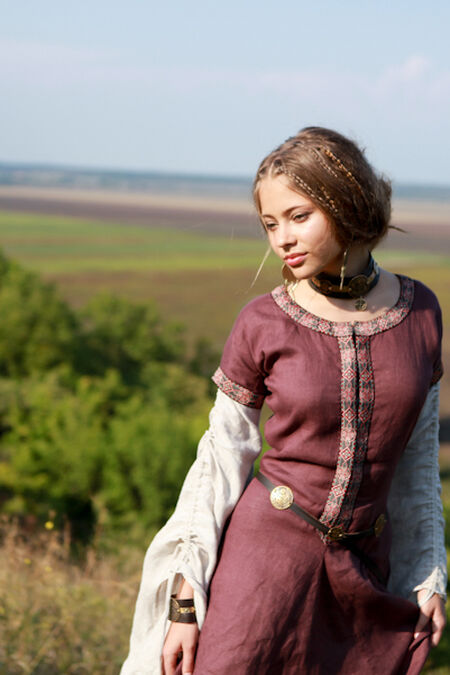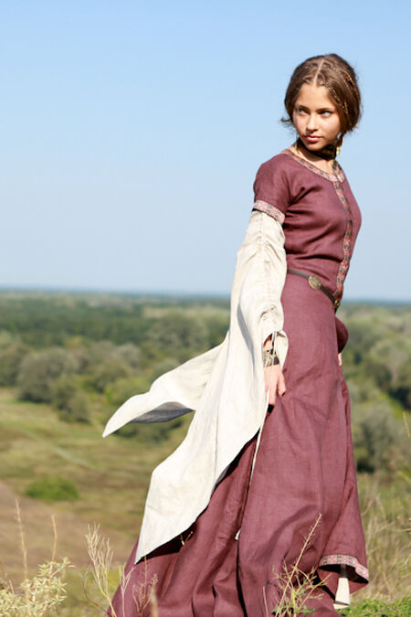 Slim fit bodice of the tunic emphasizes breast and waist while wide skirt with 4 additional gussets drapes with soft pleats. All this combines into well-known medieval silhouette of the XIII-XIV centuries.