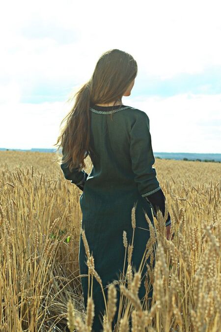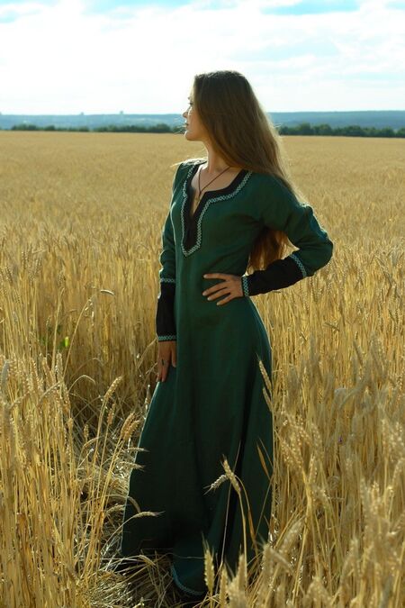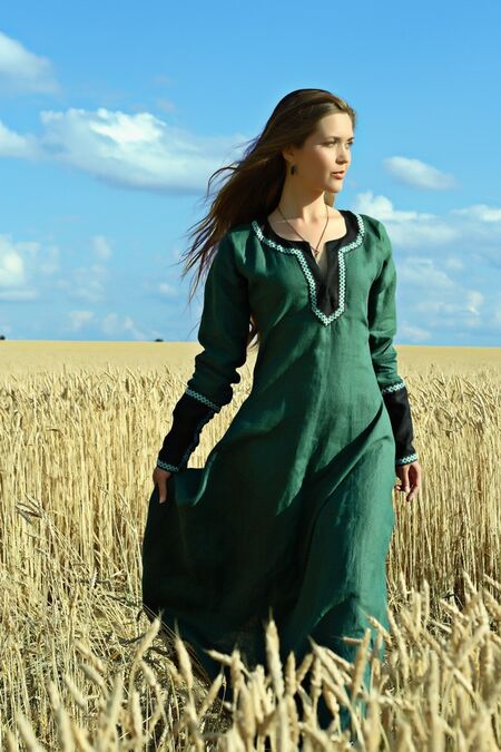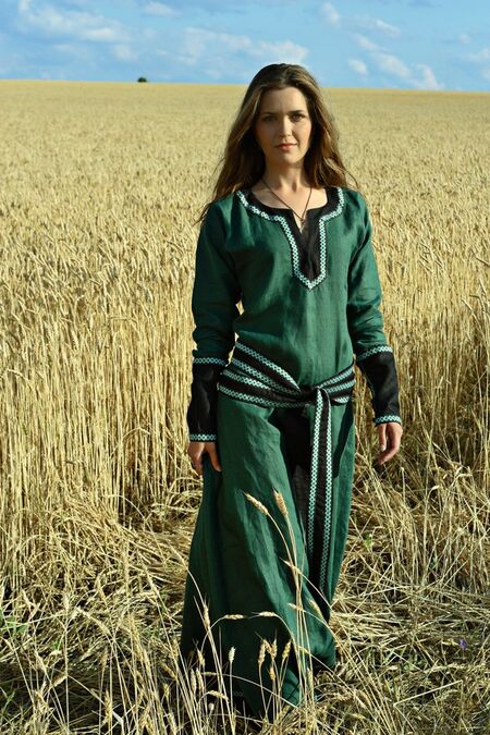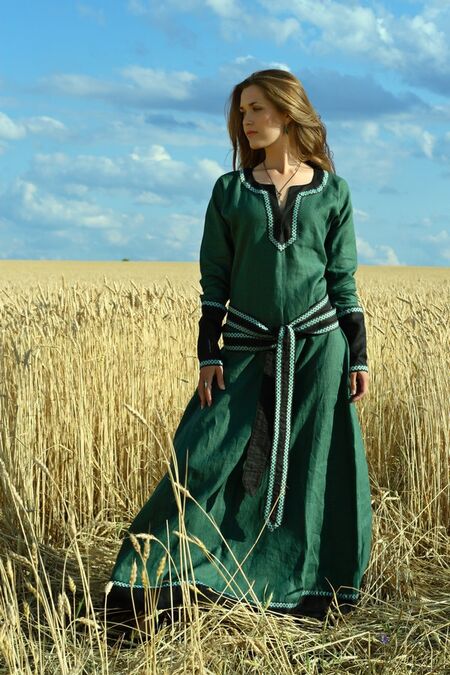 This is an elegant flax linen tunic. Actually, this garb rings a bell for late medieval tunic or early medieval dress, though it certainly has fantastic origin. It's made of 100% natural flax linen with black linen accents and with beautiful trim and elegant buttons on the sleeves.