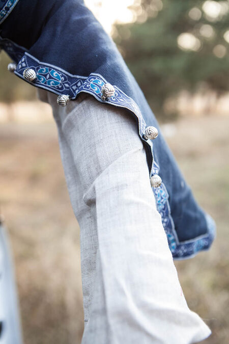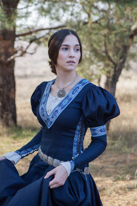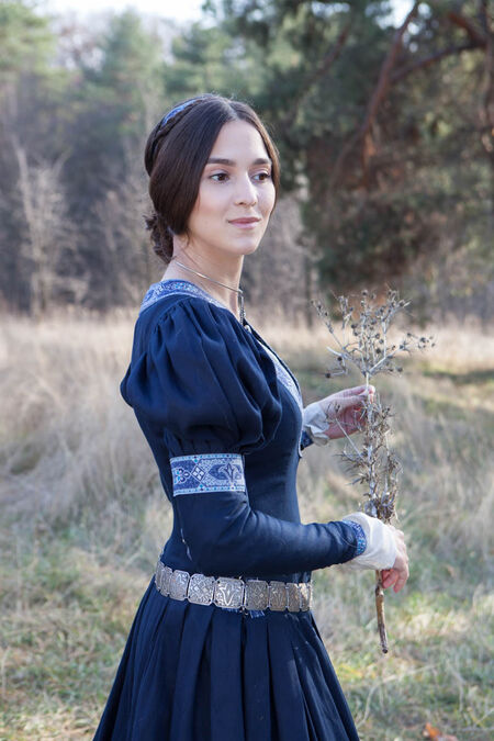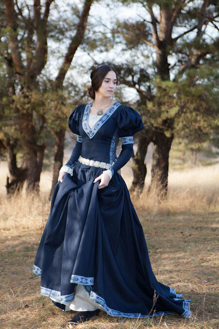 Despite what some may claim, an exiled princess is still a princess. Nobility is not about the fleeting things: flaunted luxury, superficial loyalties… nobility is something more, found in the flawless poise of the leading class. It is an ability to hold one’s head high as well as maintain dignity and self-esteem regardless of circumstances. In harsh conditions, however, one must adapt. As the princess flees the kingdom she knows she must wear a garment that is equally beautiful and practical – standards must not fall simply because one is in exile. This is a dress of reliable, simple and practical design, crafted from fine materials. As the princess sits by a campfire in a cold forest, embarks on a long trip on horseback and navigates a busy marketplace, she is equally comfortable in her clothing. While her spirit may be dampened, the crestfallen princess is held up by suitable clothing that leaves no doubts as to who she is. The elegance of the trim shows her unparalleled sense of taste whilst not appearing tacky – the refined appearance is firm evidence of her high status.
