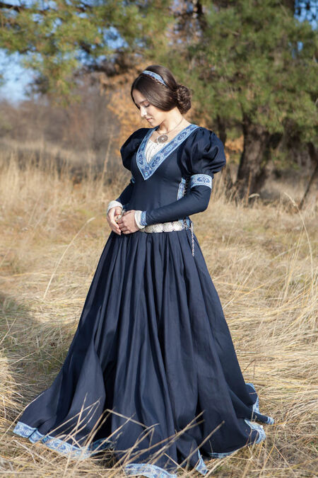 Our simple cotton fabric is used as the main material, which makes the dress more versatile. The trim around the plunging neckline, sleeves and bottom of the dress adds an exquisite air of nobility. This dress is made to make everyone look like a princess: a side-lacing bodice gently hugs the wearer's figure for a perfect fit and flatters every silhouette. Puffed sleeves are one of the distinctive features that makes the dress recognizable, and well-fitted buttoned sleeves guarantee practicality in various occasions.