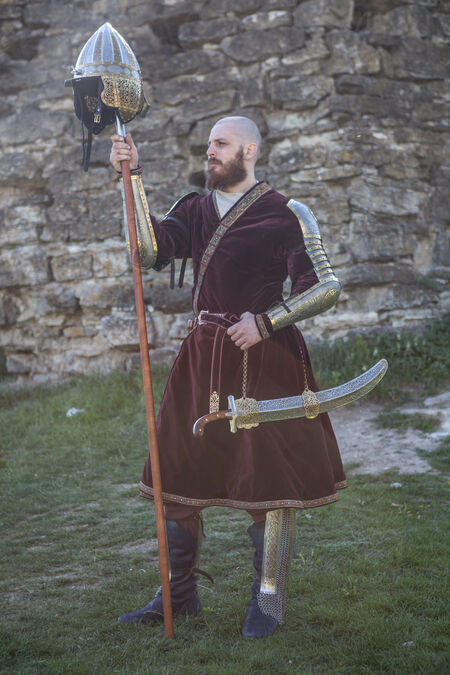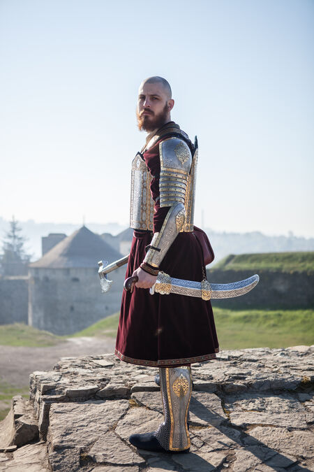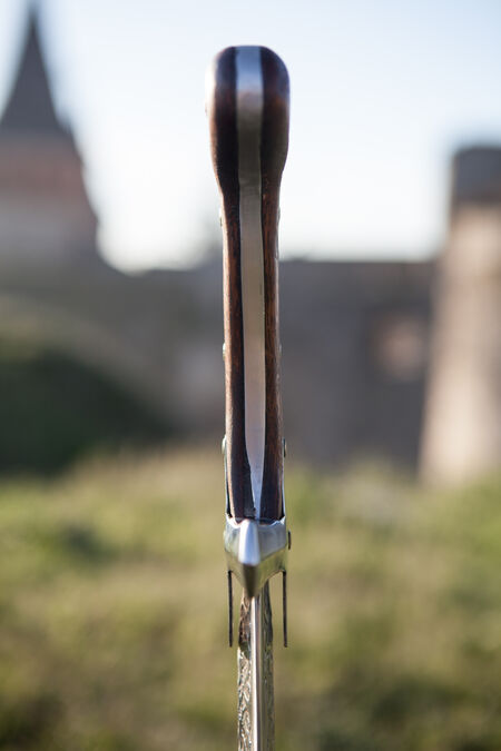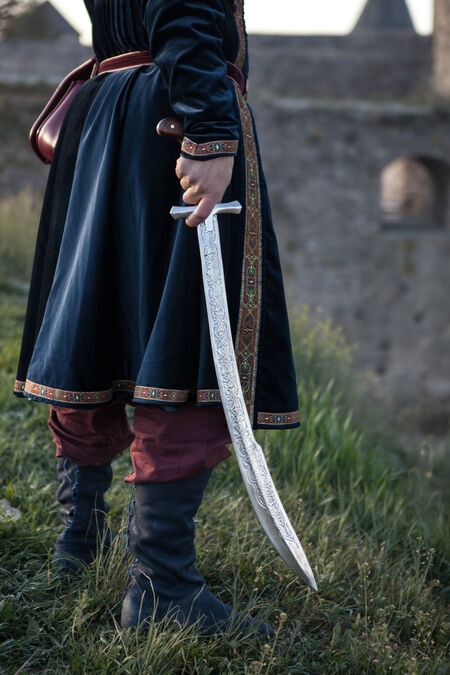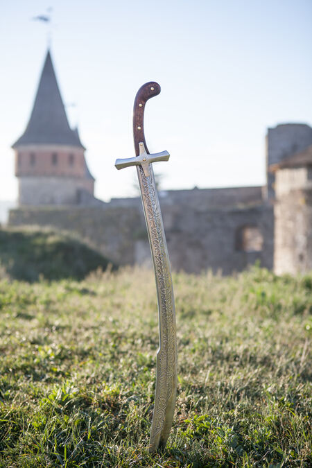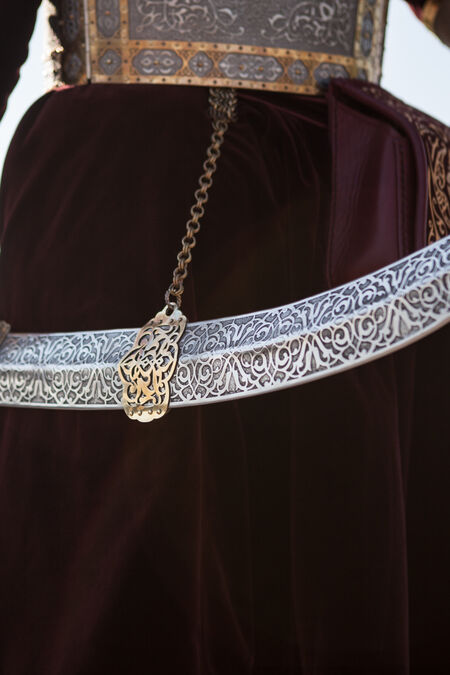 Saber is decorated with traditional Eastern motifs to match the whole kit. It's made of stainless steel sheet metal so it can't be sharpened and used for any real purpose, nevertheless you should be careful with it to don't harm anyone.