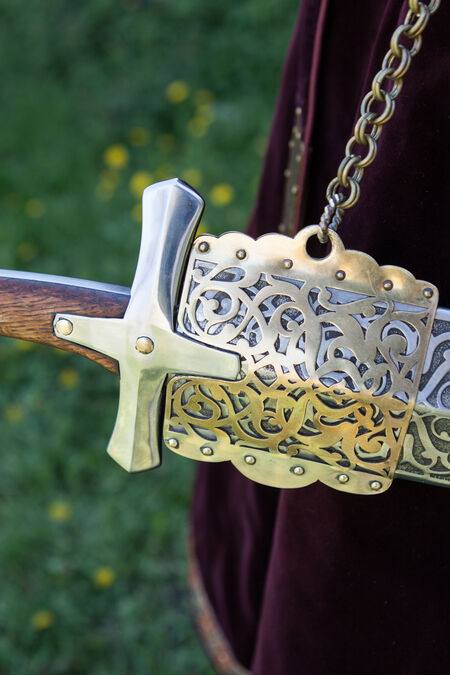 The scabbard is a matching piece. It is richly decorated with the same eastern pattern etched ornaments and cut-through brass accents and will be a great part of your eastern wardrobe. One more beautiful piece to complete your Eastern character's look whether it is for a stage, renaissance fair or SCA event.