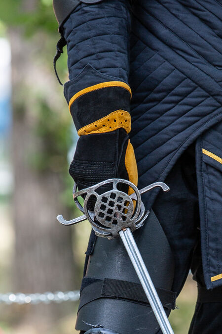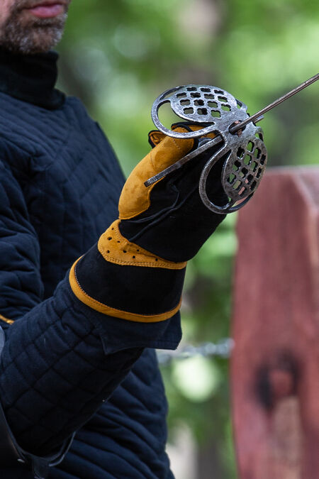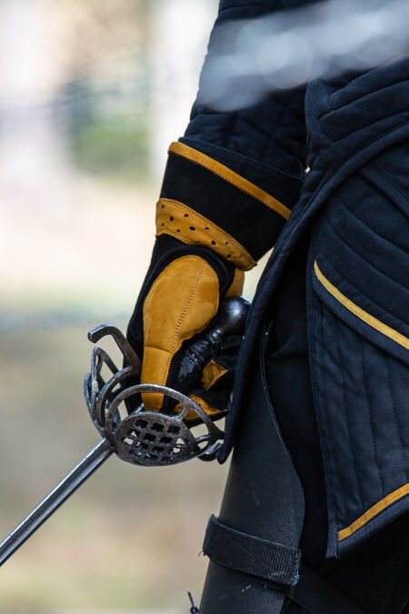 A little bit more than a year ago a couple of our team members joined HEMA, rapidly climbing to the top domestically and going internationally, and this is where the new chapter begins. These gloves are standing on the foundation of our WMA and SCA gear but adjusted and redesigned to be the best gloves possible for the HEMA rapier and smallsword combat. We also tested them successfully with a spear. They are flexible enough in a wrist, have a thin plastic insert integrated into the cuff, EVA-protected fingers, thumb, and outer part of the hand. We also solved some problems like ventilation adding perforation between fingers.