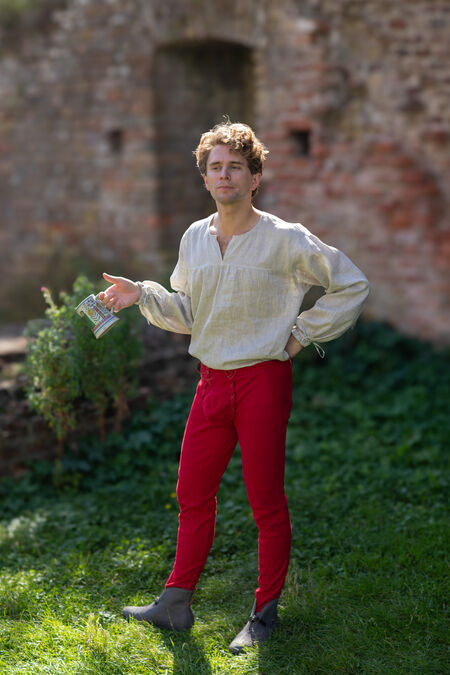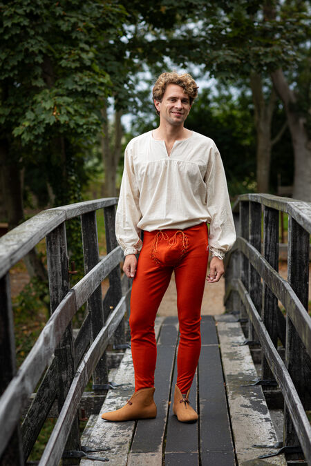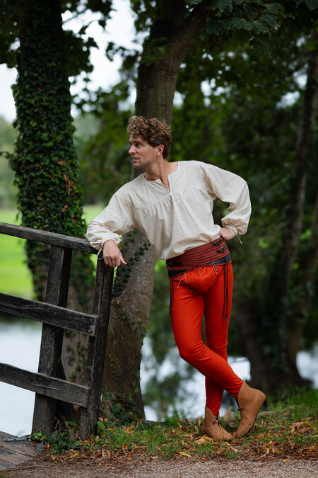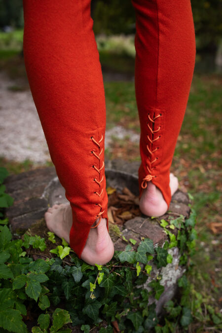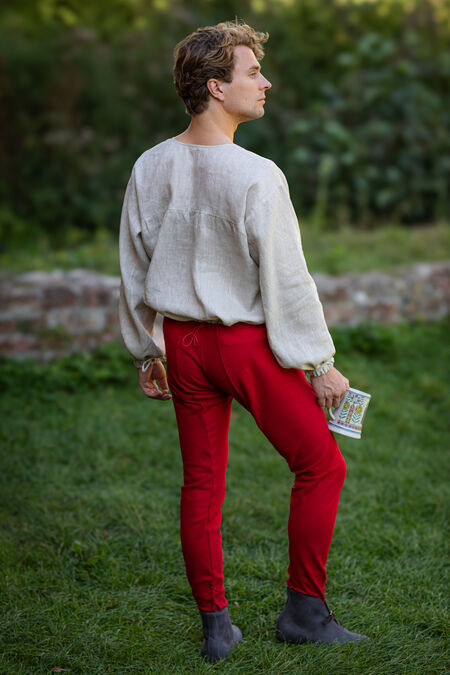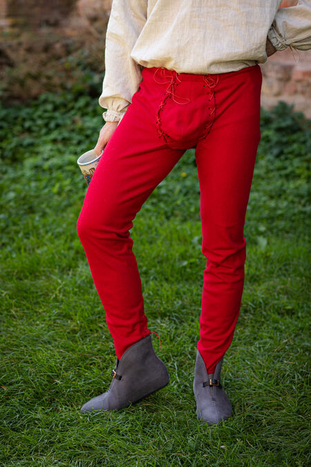Joined chausses are the transitional form of the clothes between separate hose and trousers. They are made of tough cloth cut on the bias, as the wool in this direction is more yielding and stretches almost like knitted fabric. Please note that when you hold chausses in hand, they look too long and narrow. However, as soon as they are put on, they stretch and take the shape of the owner. There is a casing in the belt that allows adjustment of the waist for several centimeters. Chausses can also be tied up with laces, straps, or ribbons to stay where you want them to be positioned.