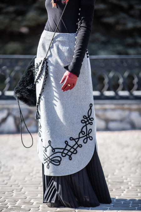For the best fit, there is a yoke at the inside of the top of the skirt, and it is lined in a luxurious satin which feels nice against your skin. The satin lining connects to the plisse wool at the bottom of the skirt, and every aspect of this garment is well finished with expert tailoring techniques. A number of very close together buttons at the side are both decorative and functional and can be used to open and close the skirt. There is also a beautiful little design at the front of the skirt, which adds a touch of class.
