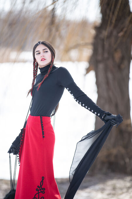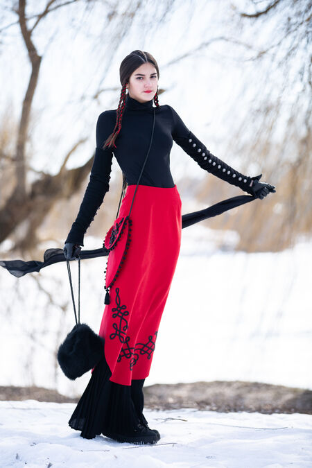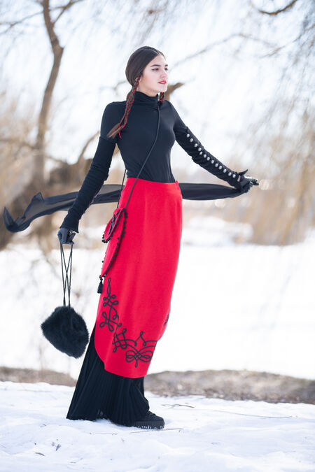 The top of the garment is not high waisted, nor does it sit down on your hips, it is in between. It comes in at the waist and tapers out over your curves like a flattering pencil skirt. Even though it appears fitted, it doesn’t actually hinder movement and is very comfortable. The main part of the skirt goes down to just below your knees, sloping up at the sides in a neat, artistic way. From the bottom, an additional panel of the skirt - made from a thinner, Plisse style fabric - flares out to the ground, swishing stunningly as you walk.