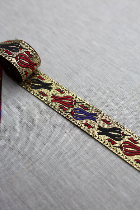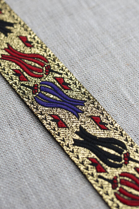 This trim, with a contrasting floral pattern, will be perfect for a variety of personas and add an eye-catching nuance to your DIY medieval project thanks to the bright golden background and red, blue, and black tulips over it. Just look at those colors!