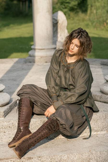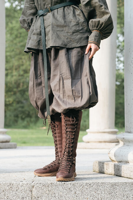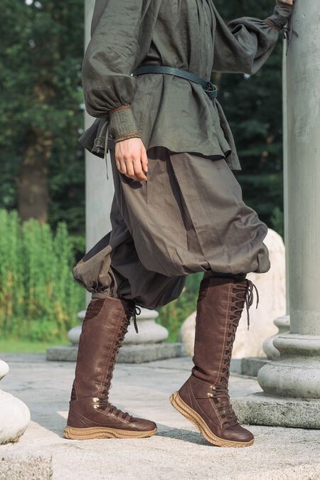 Thank you for your kind words about our boots! We're glad you love them. The pants featured in the photo are our Linen Viking Pants. They are designed to complement our footwear and provide a comfortable, authentic look.