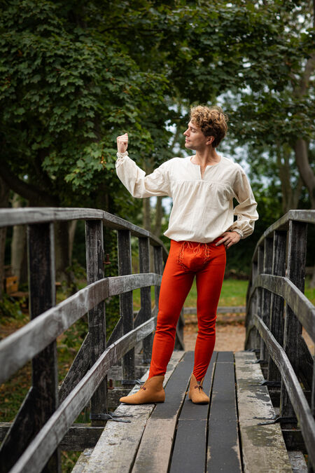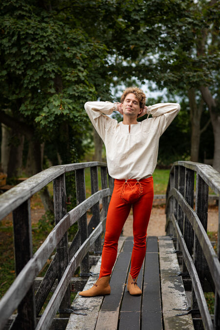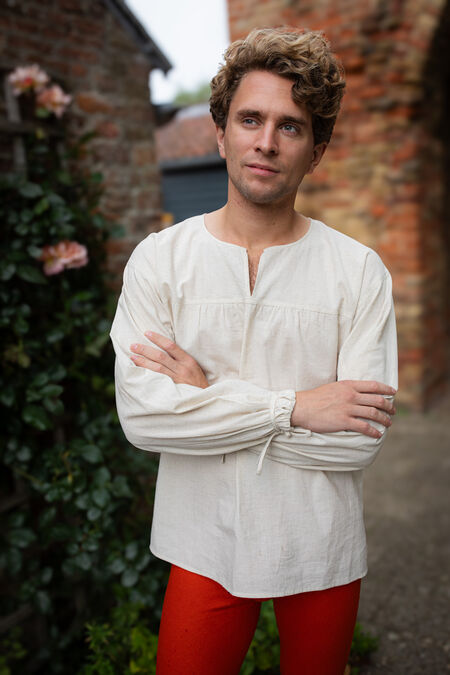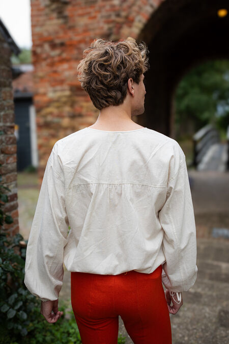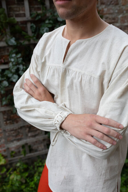 This shirt is transitional in many ways. It’s a step from the tunics popular in the Late Middle Ages towards the Early Renaissance men’s style. It’s made of blended 100% natural linen-cotton poplin, with 40% linen for the best breathability and heat control, and 60% cotton poplin, commonly used for dress shirts, for a smooth, flowy, and nicely draped look.